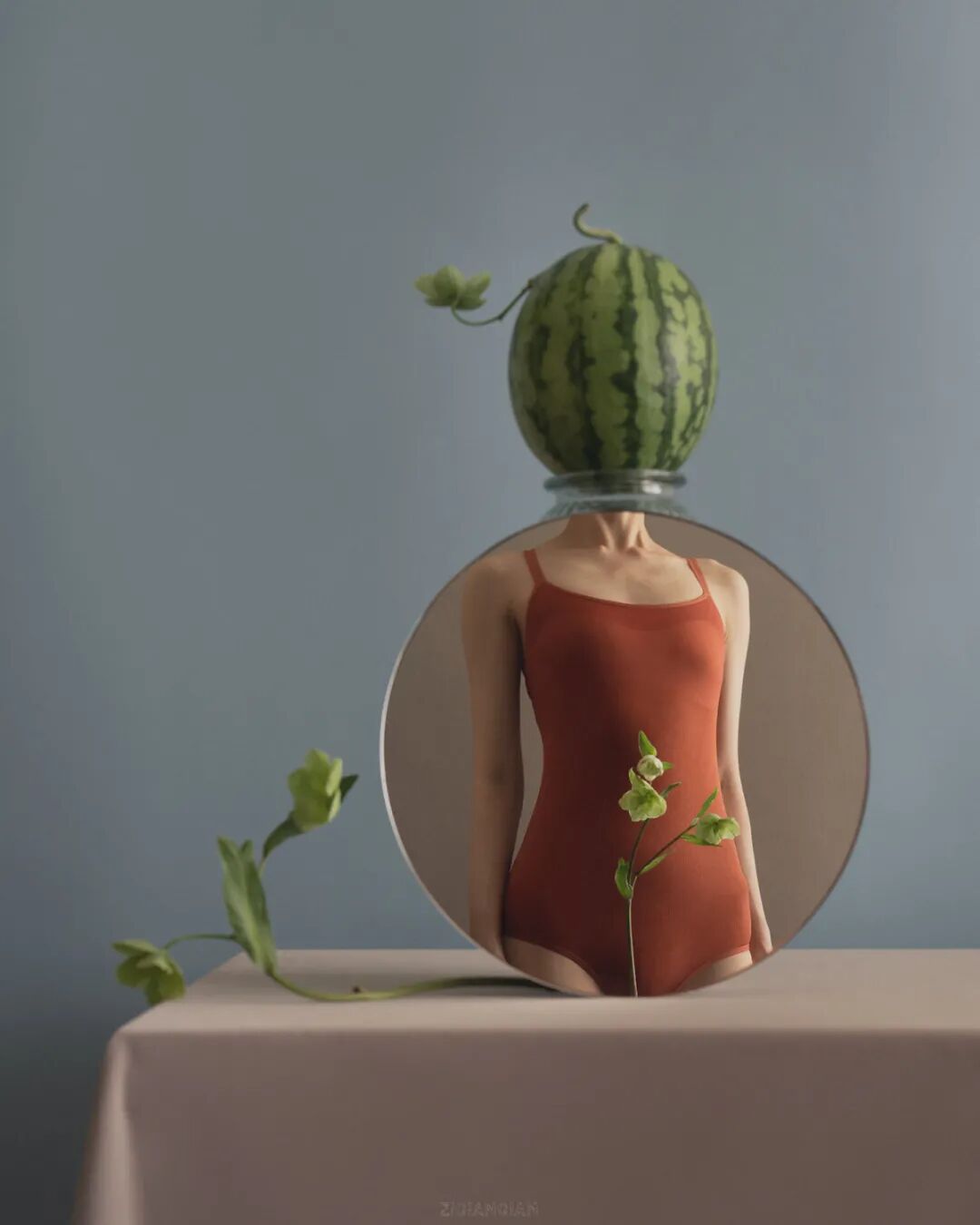 从刘自谦的作品中,我们常常可以看到,有花朵和水果的元素出现,这样做的目就是让人感觉到,人与自然环境之间有一种和谐的状态。虽然,这是摄影作品,但是,在小绛看来更像是一幅超写实画作,透过这些照片,仿佛看到达利的影子。