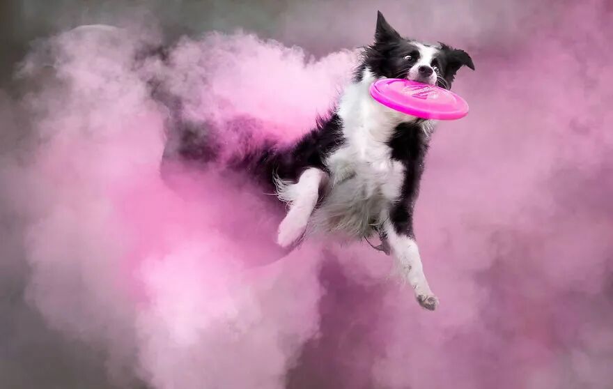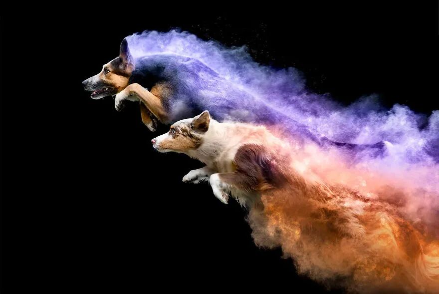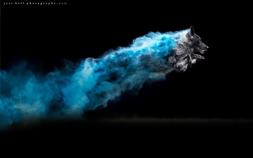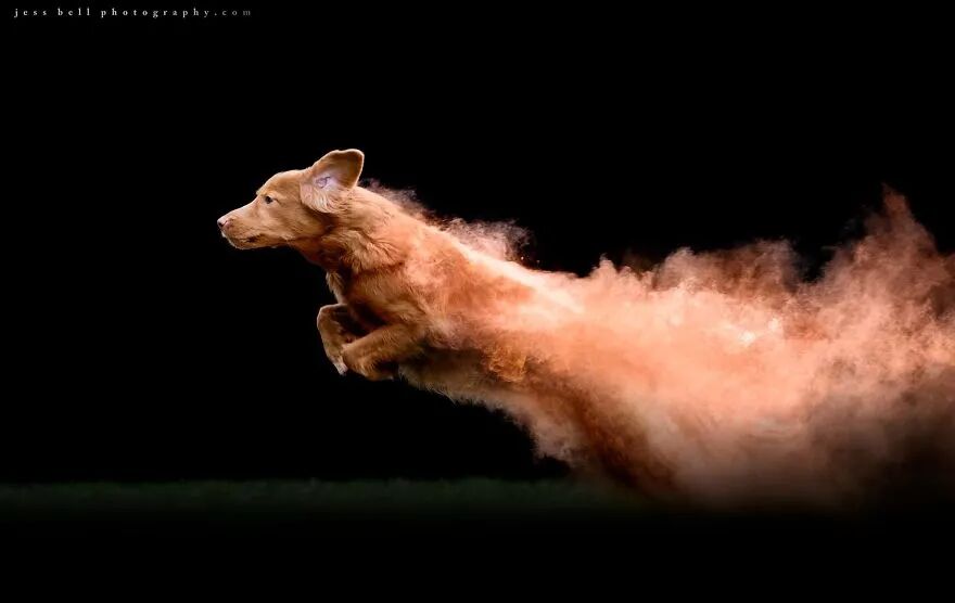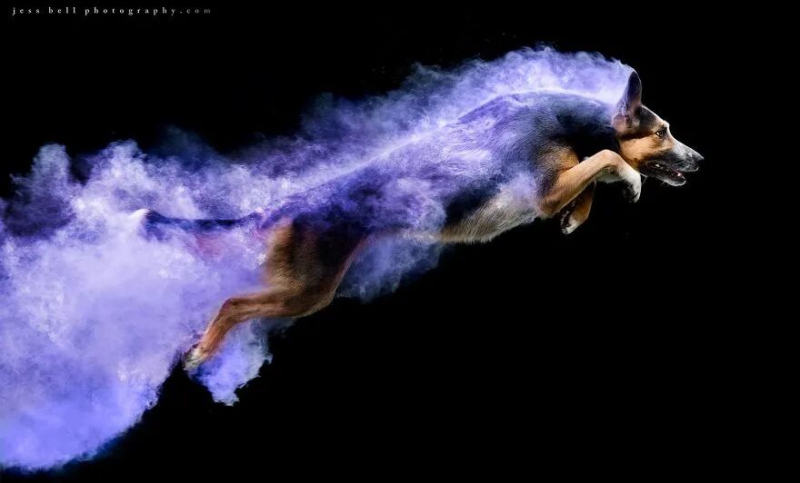 在前不久,杰西·贝尔创作的一组摄影作品中,杰西·贝尔就将带有色彩的粉末洒在狗身上,然后诱使狗跳出去,从而狗身上的彩色粉末会随着狗的跃出洒到空中,被照相机捕捉下来,让人看起来狗仿佛像是在燃烧一样。