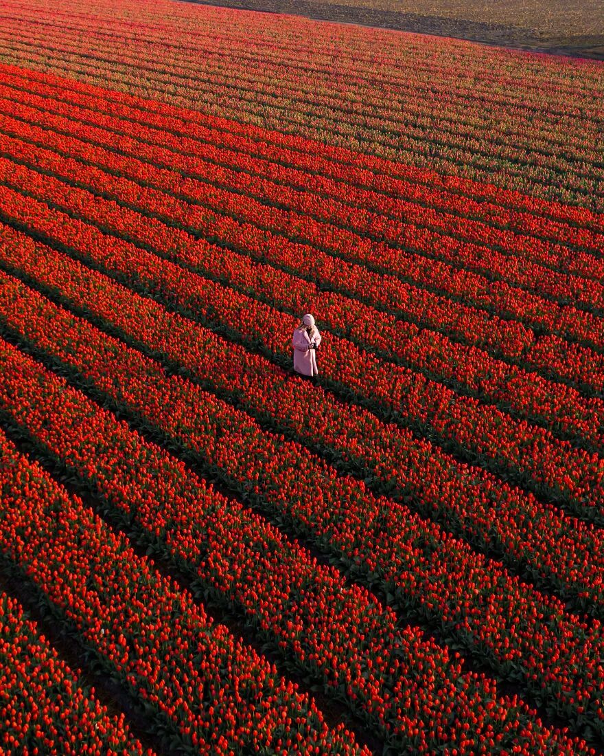7、荷兰红色的郁金香田。
