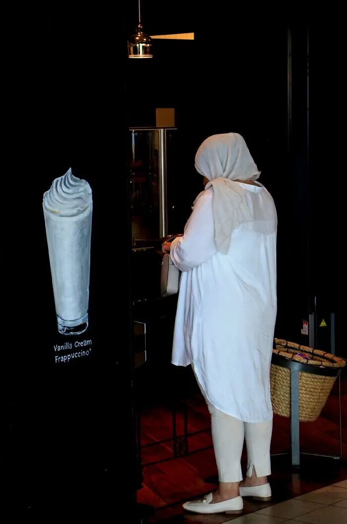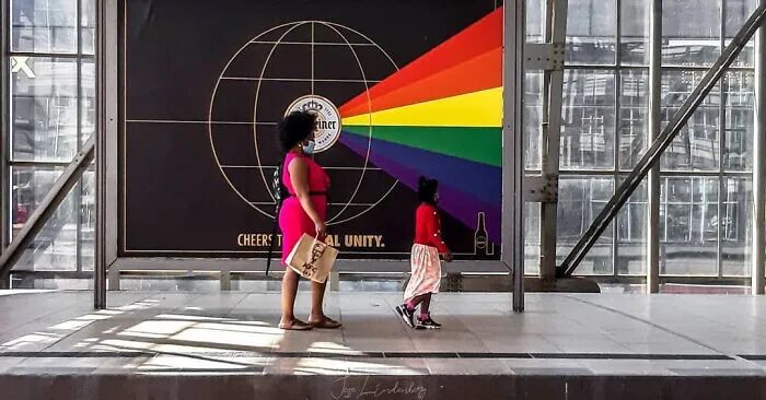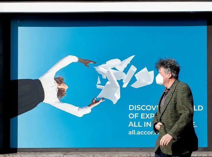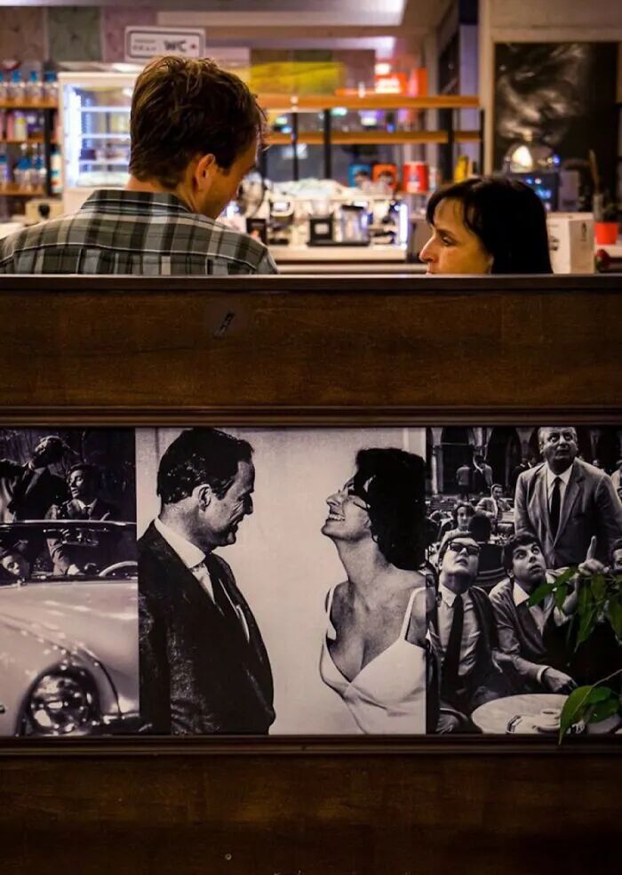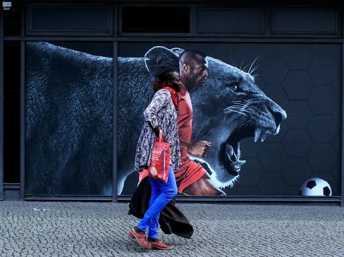 至于为什么要拍摄巧合的街头摄影,林登伯格说,这来源一个偶然的时刻,“在瑞士的时候,我发现一个霓虹灯广告,广告上有一个戴着围巾的女人,而在广告牌旁,就有一个戴着类似围巾的女人,广告中的女人和真实的女人,仿佛在互相交谈,看到这一刻时,仿佛看到了一个有趣的故事。”