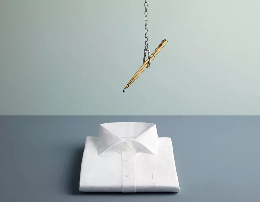 7、一滴从钢笔上流出来的墨水,就快要滴到白衬衫上,让人感觉到这件干净的衬衫马上就要变脏。