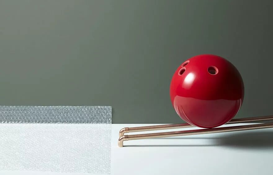 4、一个快要滚动到气泡包装袋上的保龄球,仿佛可以听到气泡被压破的响声。