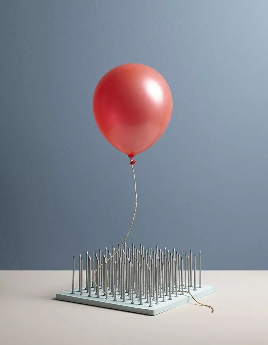3、漂浮的气球下面 ,有个满是钉子的板,让人感觉不用多久气球就会被扎破。