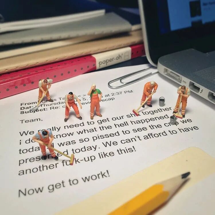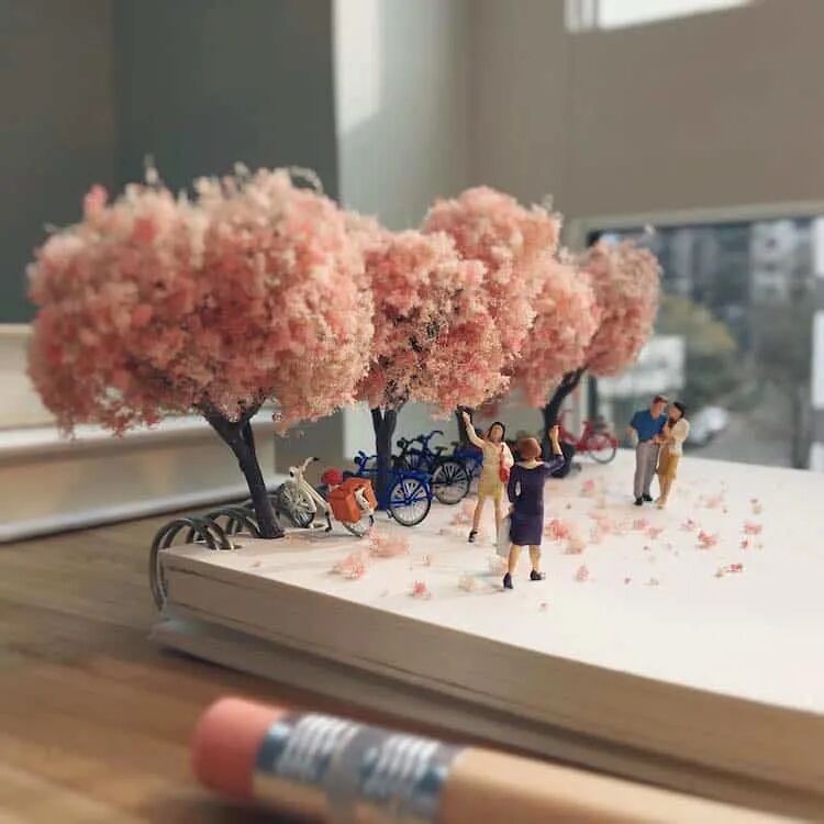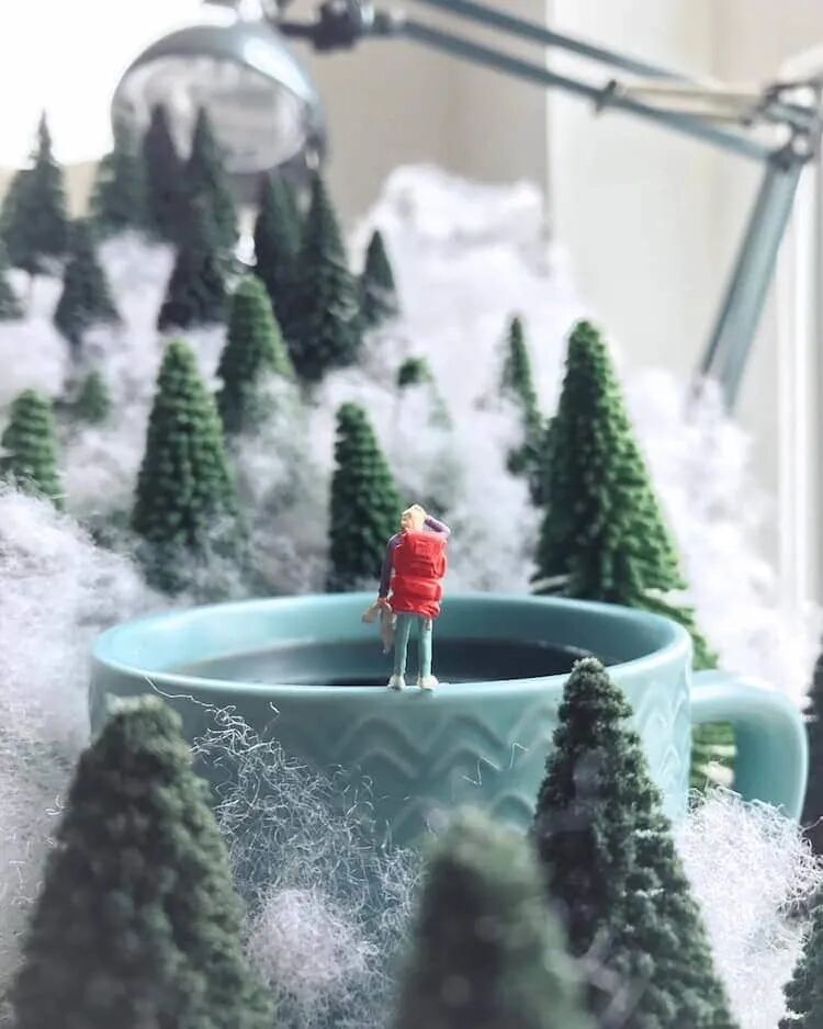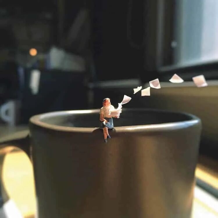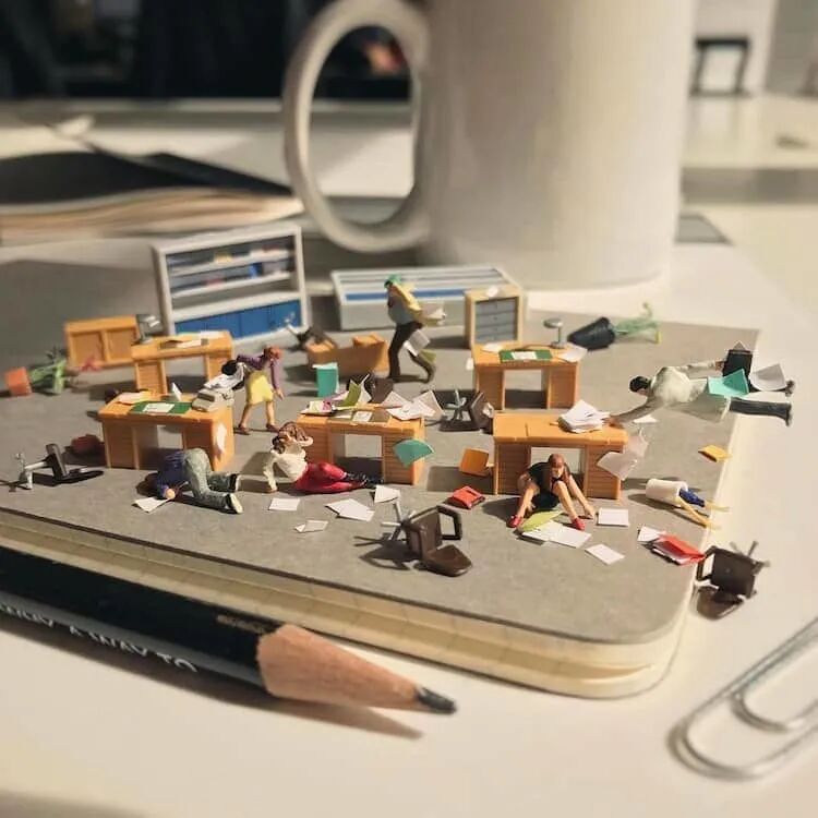 一张办公桌,该如何在不影响其他人休息的前提下,给自己找点事做?我们可以跟德里克·林学习一下,德里克·林是一位微缩摄影师,他就察觉到人们在办公室有多么无聊,于是,开始办公桌上的微缩摄影。只需要一个手机,一些微缩的卡通道具就可以拍出非常好玩的微缩摄影作品。