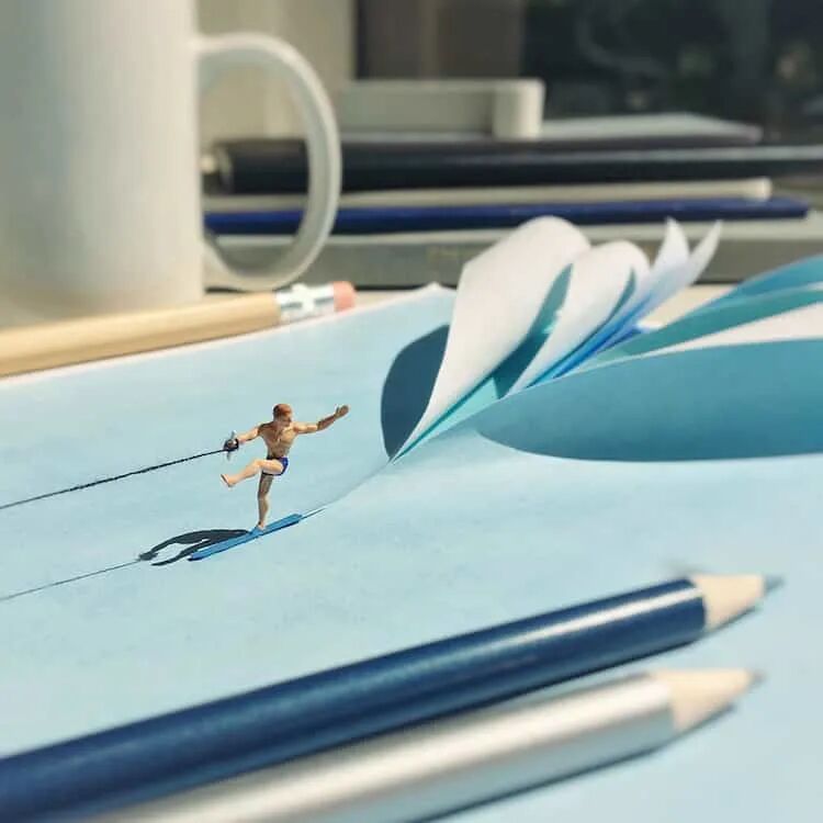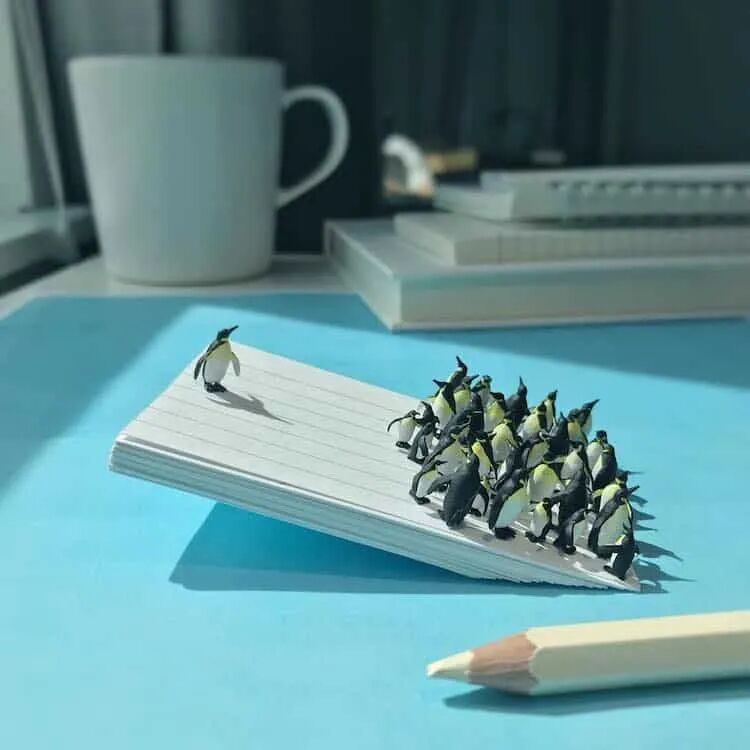 大多数人的办公桌上,都会有茶杯、书本和各种笔,而这些普通的办公用品,就可以通过一点点创意,组合成好玩的微缩场景,然后,再将卡通道具摆放在场景中,一个有趣的微缩摄影作品就制作完成了,德里克·林将这组在办公室制作的微缩摄影作品成为办公室生活的小胜利,这组作品确实可以为我们许多人提供打发时间的办法,对于无聊的生活来说,这些微缩摄影确实称得上是一场小胜利。