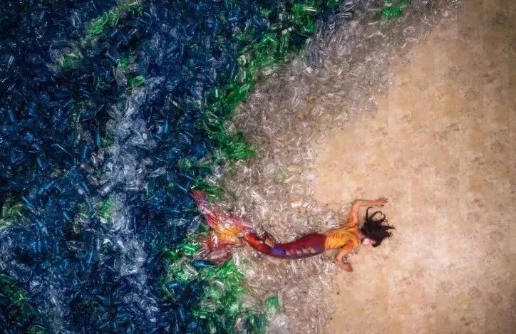 这些完全是废品的塑料瓶,主要有3种颜色组成,那就是白色、绿色和蓝色。这些颜色恰巧组成海洋的形态,而一些深色的地带,则是由黑色的垃圾袋组成,最后再加上一条由人扮演的美人鱼,就形成了这组壮观的摄影作品。