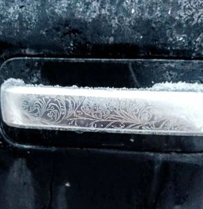2、在寒冷天气,汽车门把手上出现的漂亮花纹。