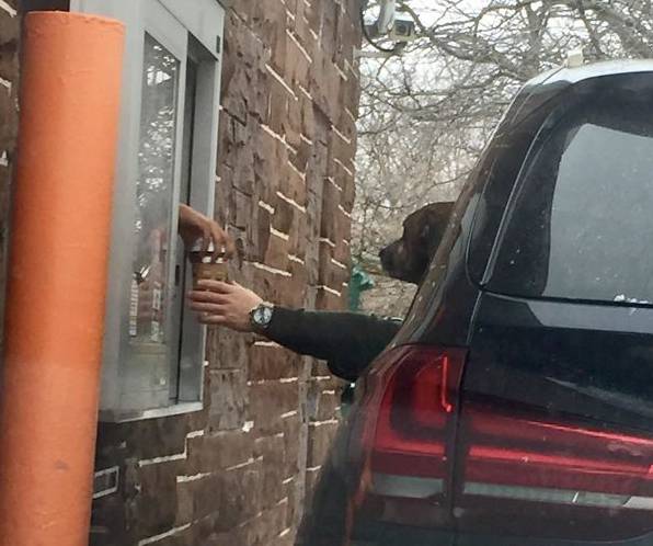 13、主人停车取咖啡,车里的狗狗刚好伸出头来。