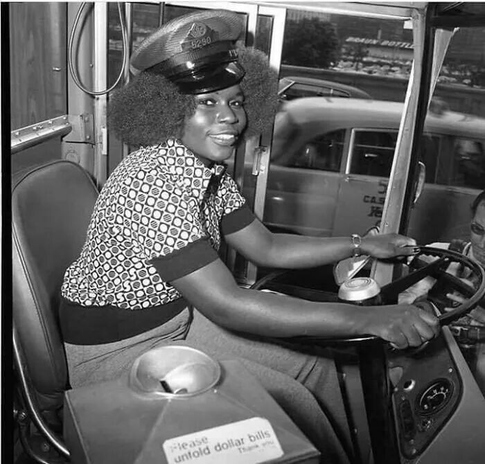 芝加哥交通局的第一位女巴士司机正在工作中,拍摄于1974 年。