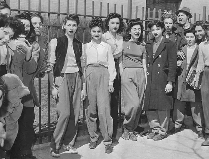 一群抗议禁止女孩穿休闲裤的规定的高中生,拍摄于1940年。