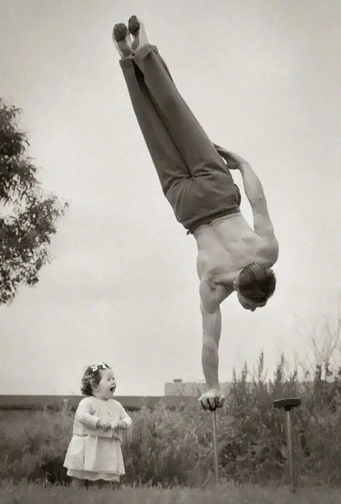 一位父亲向他的小女儿炫耀他的技能,拍摄于1940年。