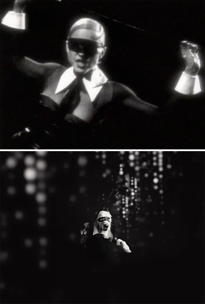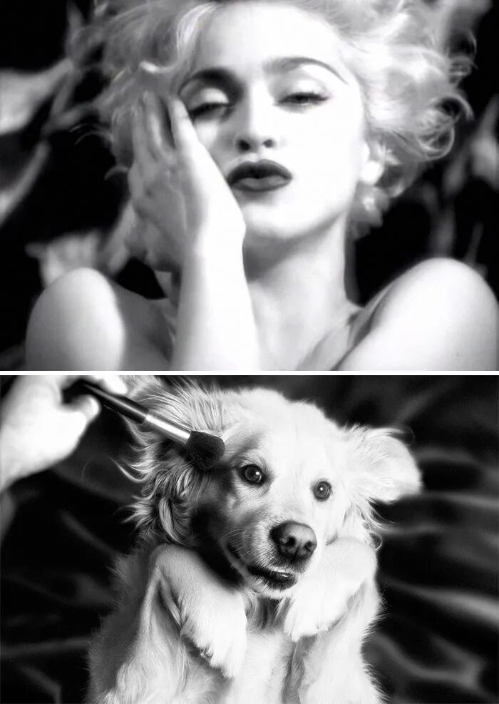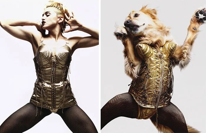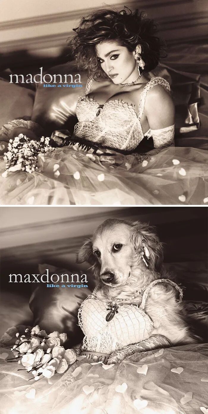 文森特很早就发现了麦克斯的模仿天赋,于是在最近他突发奇想,与自己的狗子开启了这样一个模仿麦当娜标志性照片,再现麦当娜著名音乐封面的项目。他们做好了充分的准备,服装、假发、帽子一应俱全。