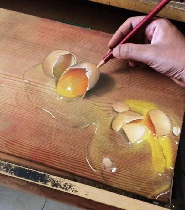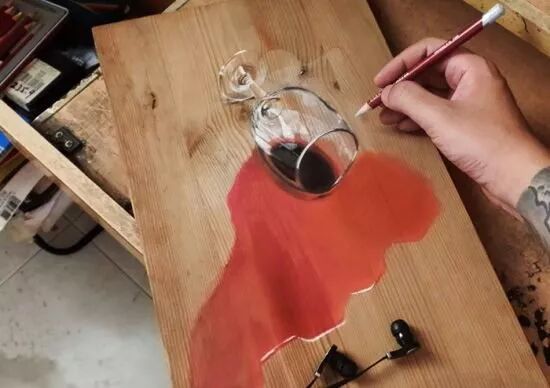 伊凡擅长在木板上画画,打碎的鸡蛋,洒掉的红酒,揉皱的杂志......呈现在木板上,逼真的造型以及立体的姿态,让人分不清是实物还是画出来的,恨不得上手摸一把才能确定自己有没有看错。
