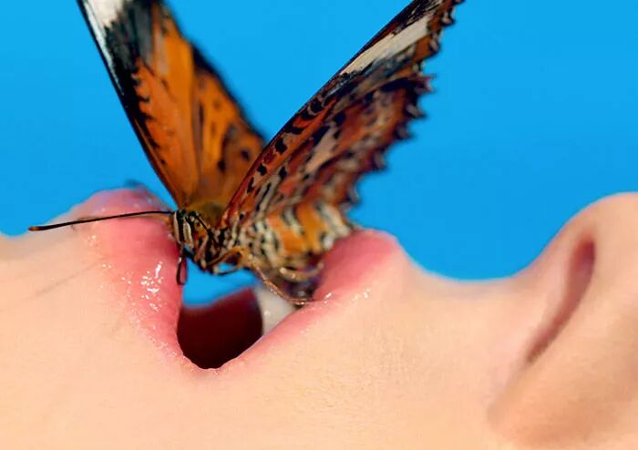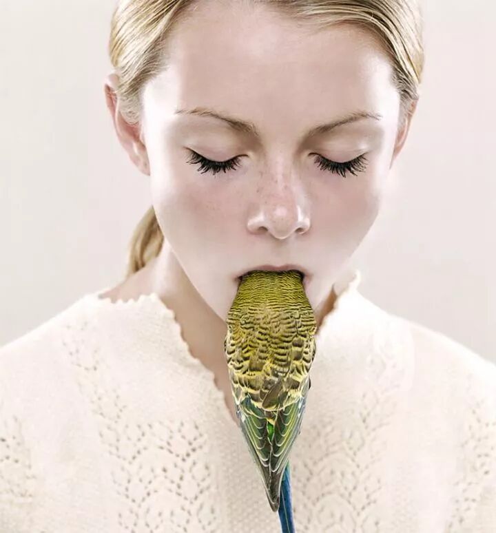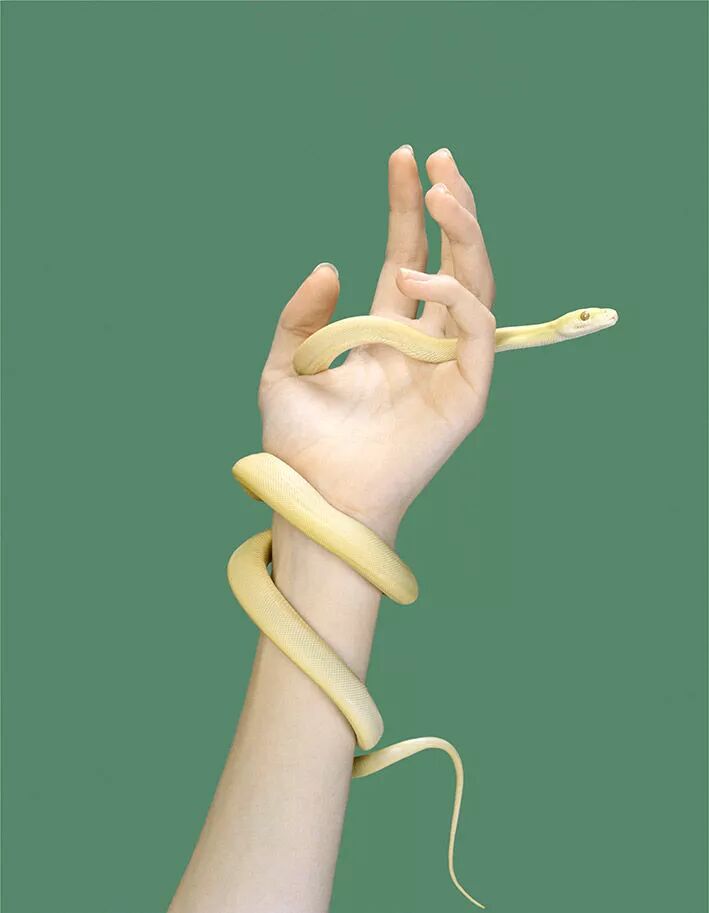 在佩特里娜·希克斯的照片中,最常出现的动物有狗、蛇、鹦鹉,模特摆出各种造型与它们互动,或将它们缠绕在手臂上,或令其趴在一旁,或吃进嘴里。