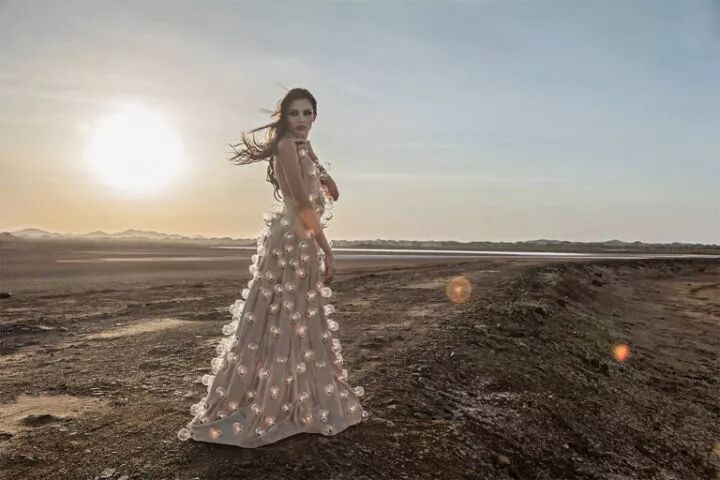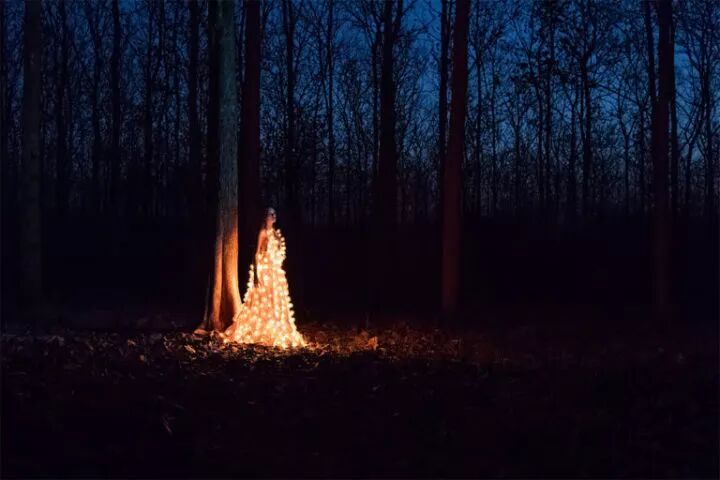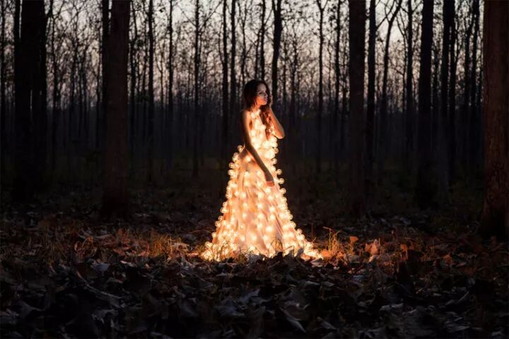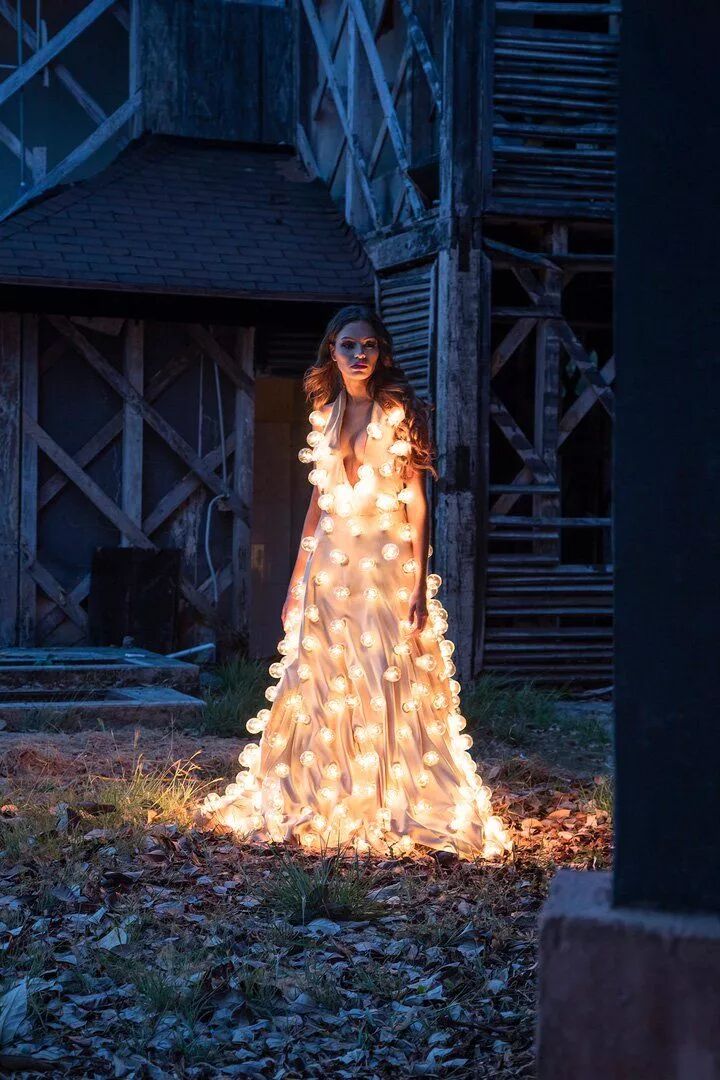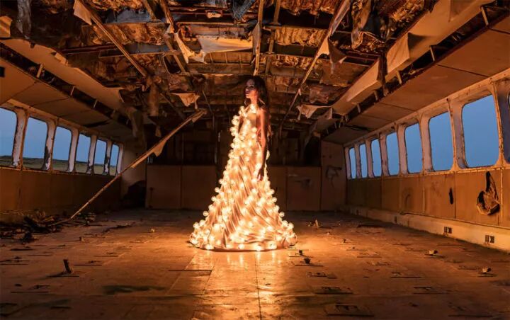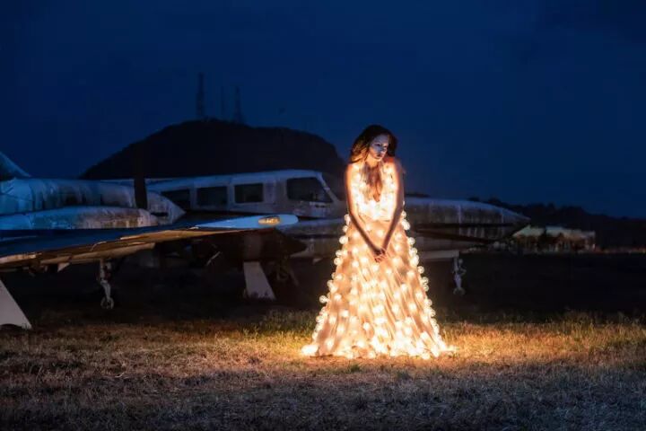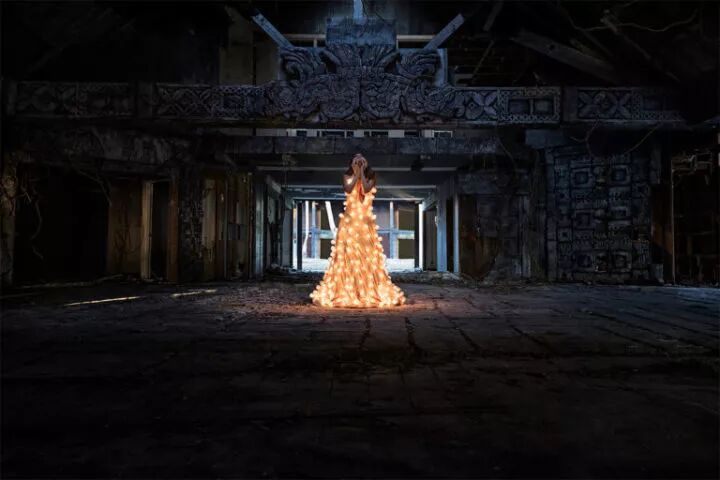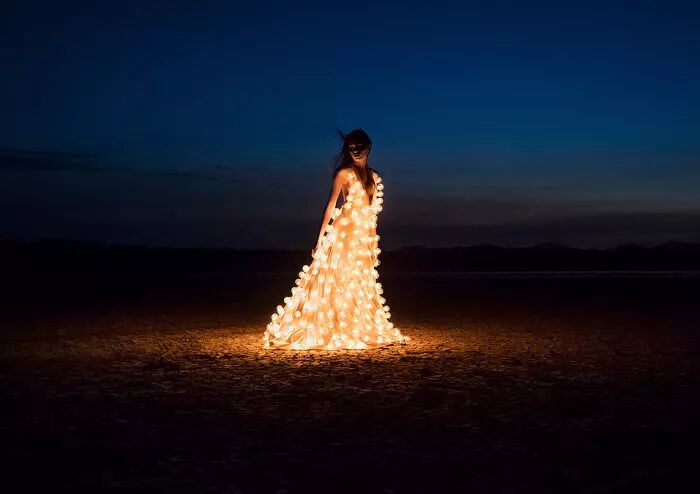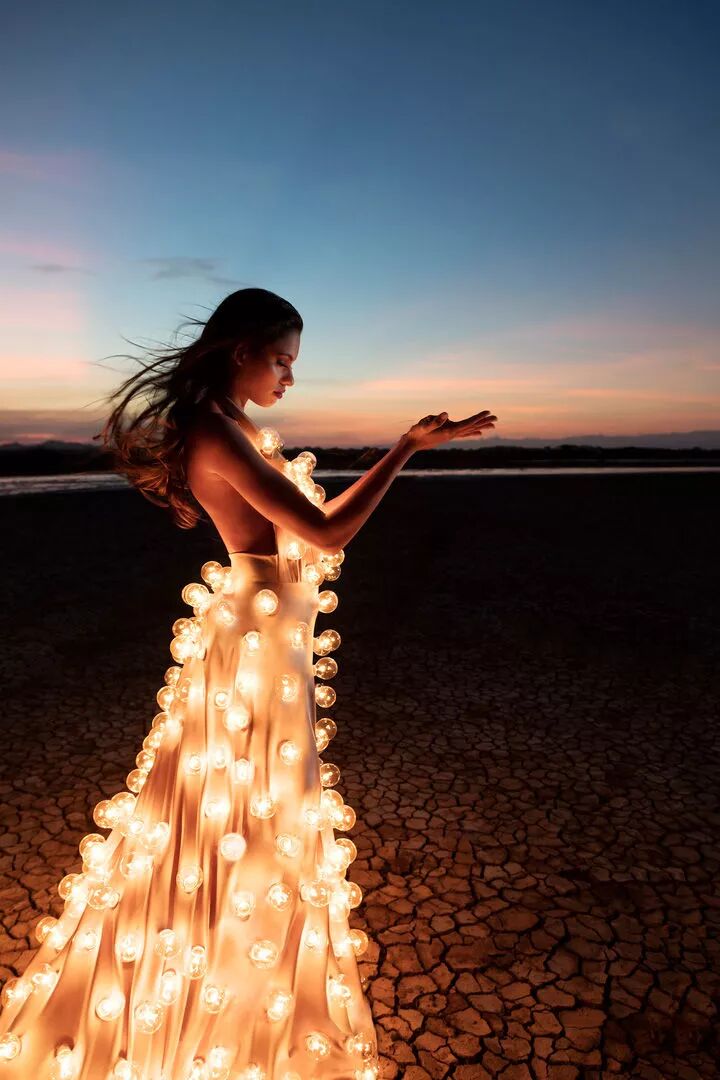 这组作品是来自摄影师埃斯特班·布罗科斯的《熄灯》,埃斯特班·布罗科斯在创作这组作品前,先设计了一条装有300个灯泡的连衣裙,再点亮这些灯泡,让模特穿上摆出各种姿势进行拍摄。