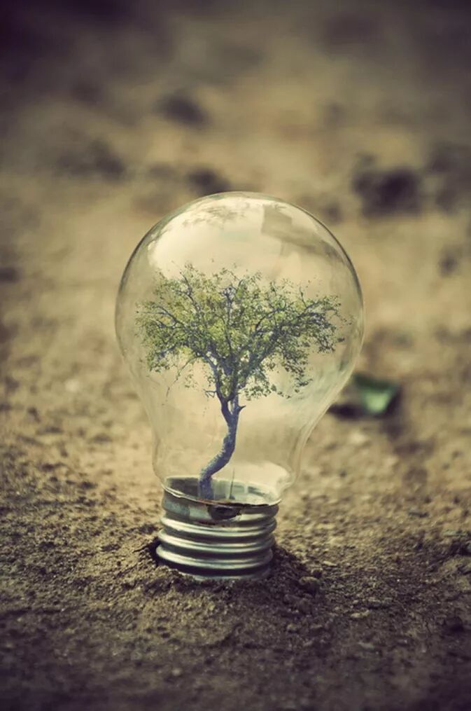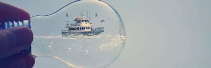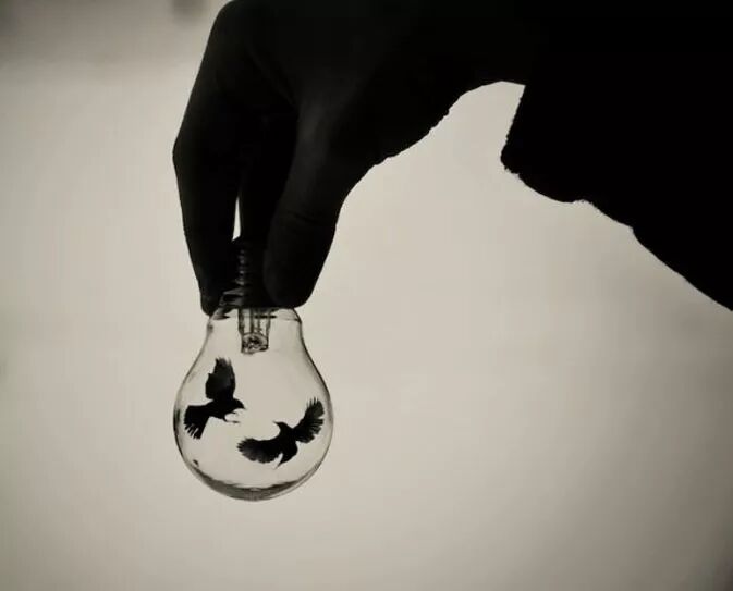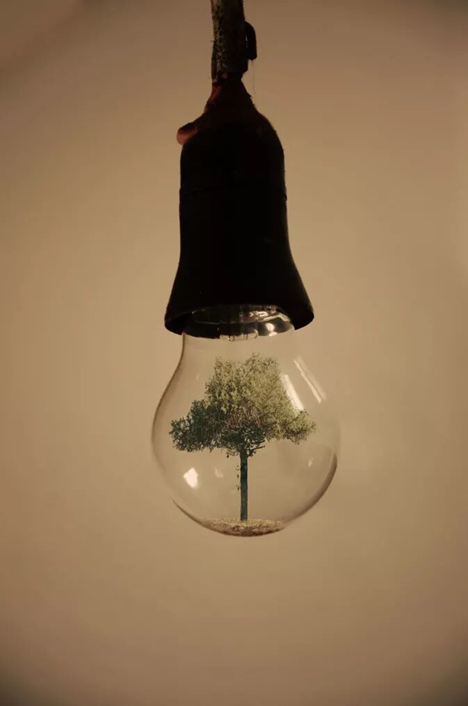 他把普通的灯泡照片进行了特殊的处理,将一些看上去与灯泡毫无关联的元素“植入”灯泡内,于是一棵树、一只鸟,一艘大船......与灯泡一起,串成了一个独立的静谧的空间。
