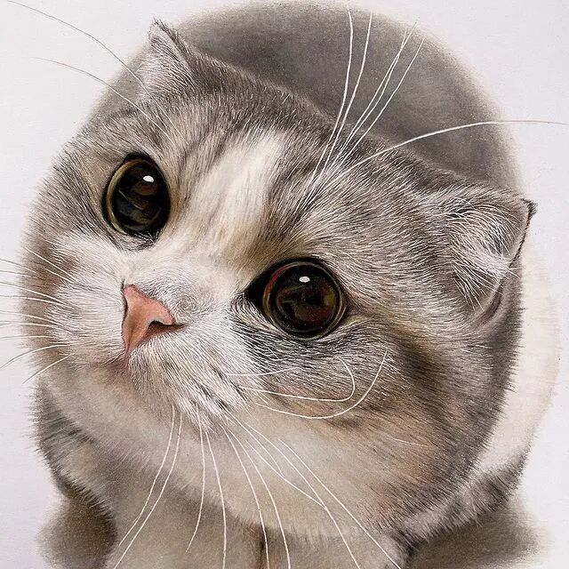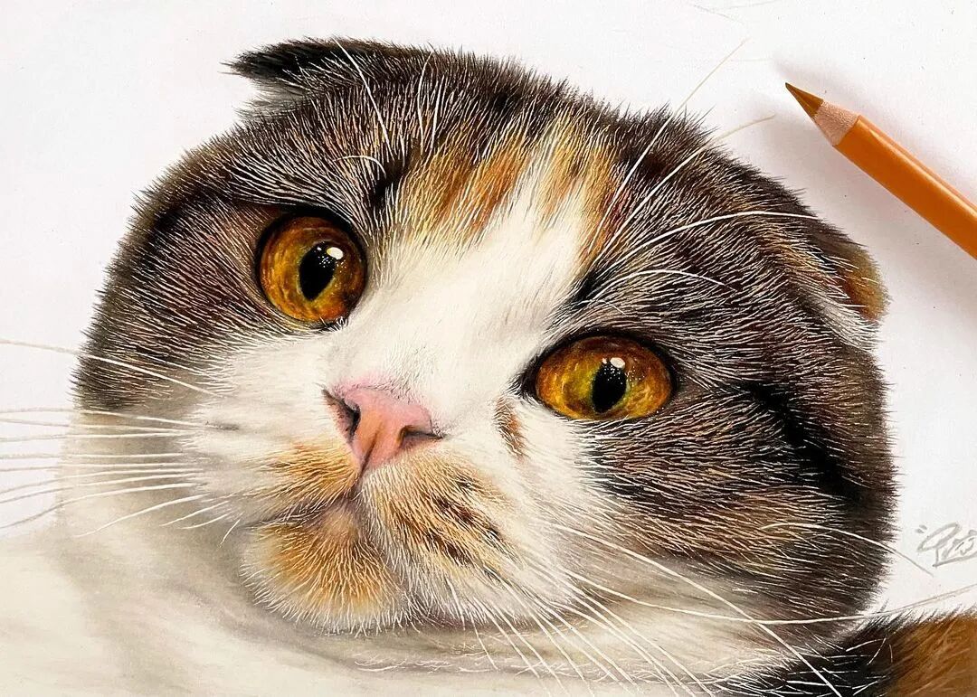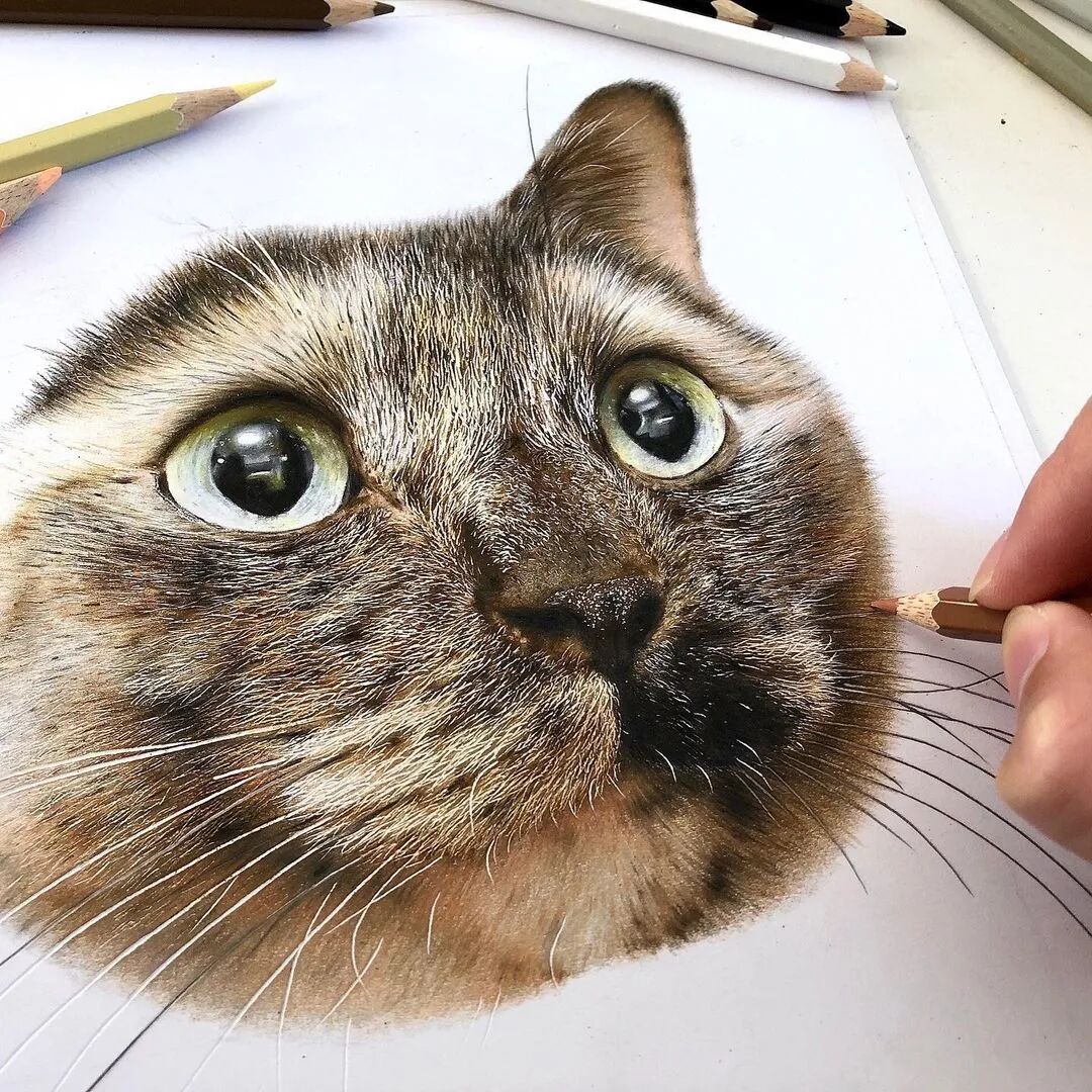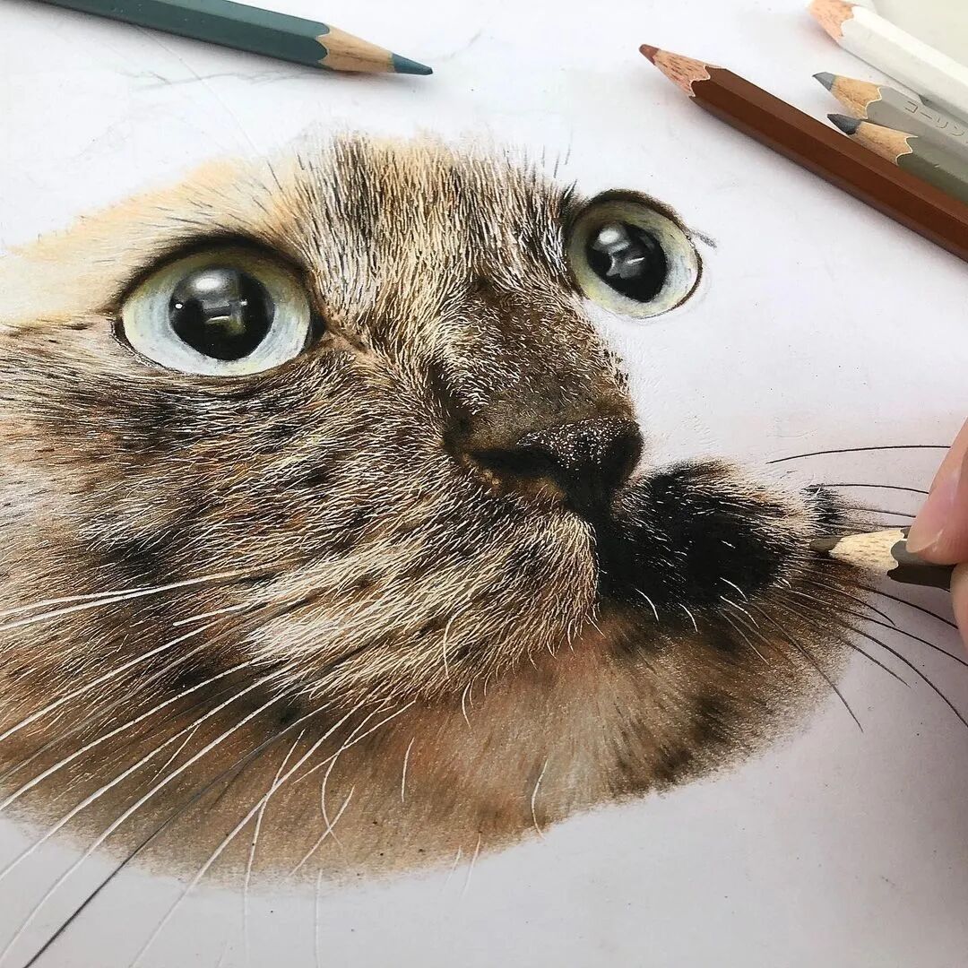 值得一提的是,工藤春树的超写实画作都是用彩色铅笔绘制而成,用彩色铅笔画到如此精细的程度,他算得上佼佼者了,工藤春树在绘制超写实彩铅画作的时候,会先用铅笔素描来起稿,然后再利用不同色彩的彩色铅笔为猫增加上颜色,我们即使不用放大图片,都可以看到工藤春树为猫描绘出来极其细致的毛发与灵动的大眼睛。