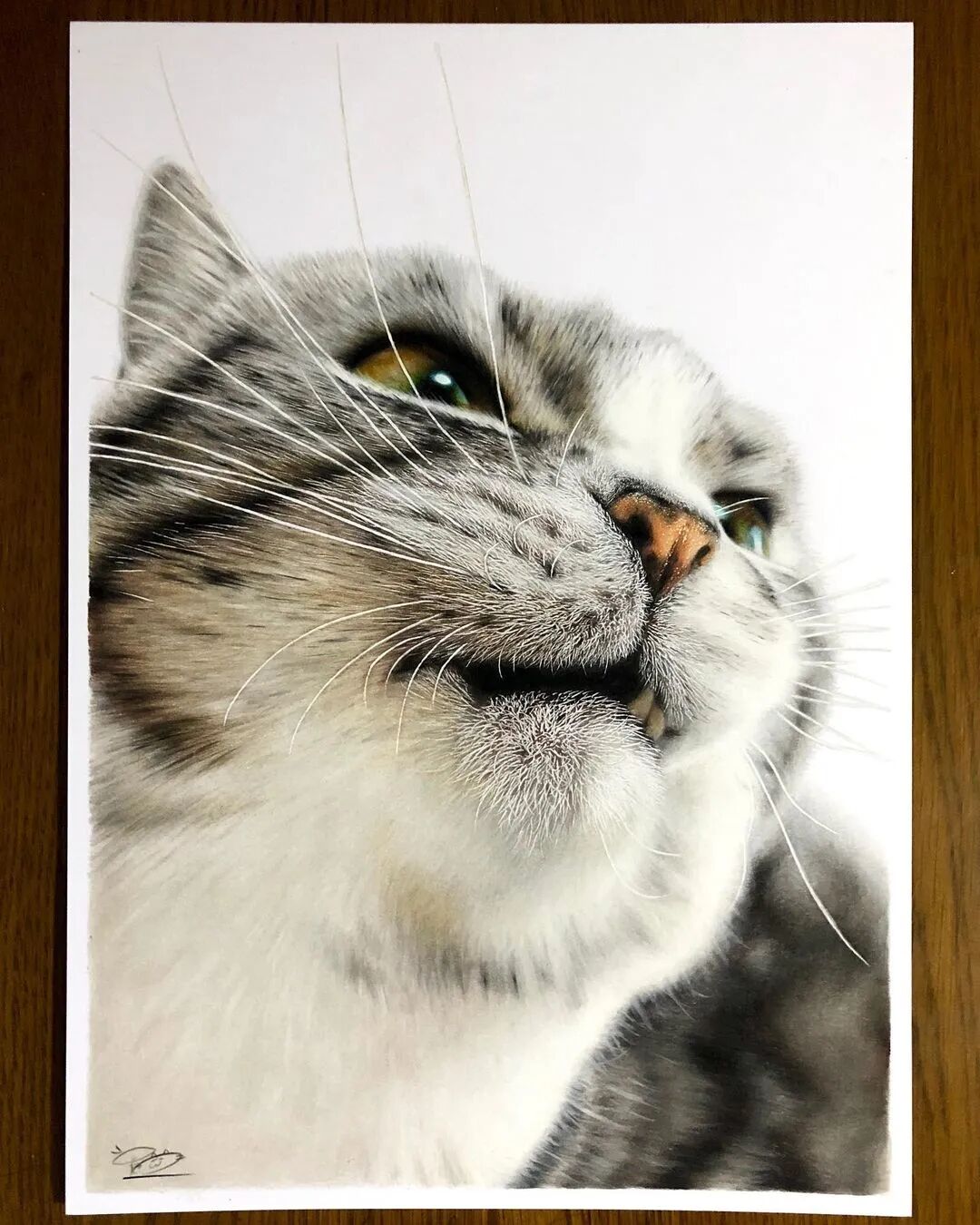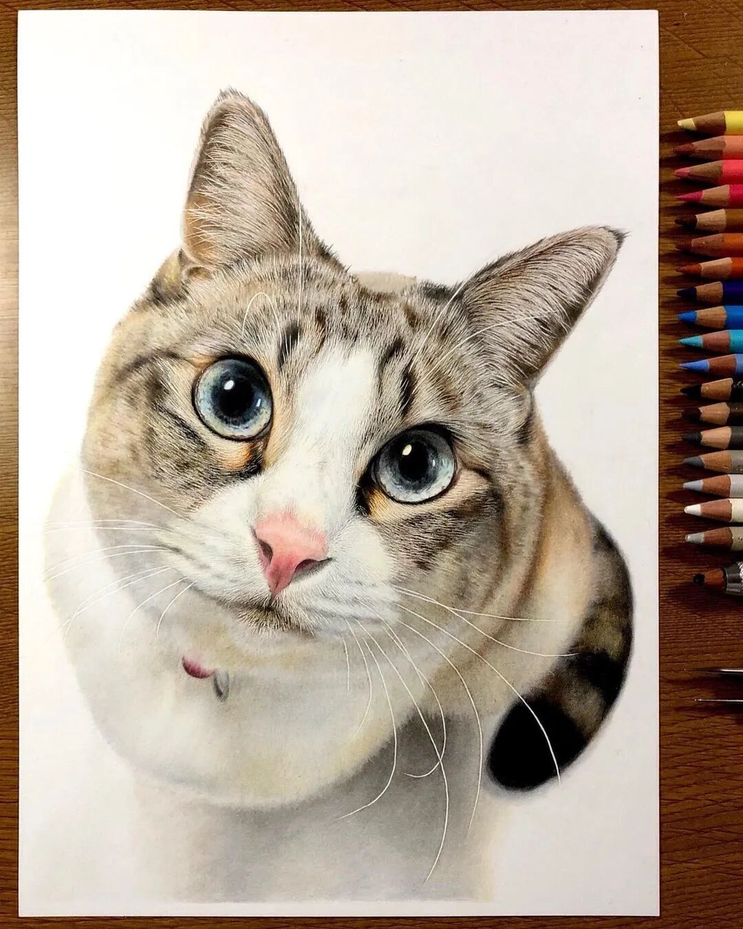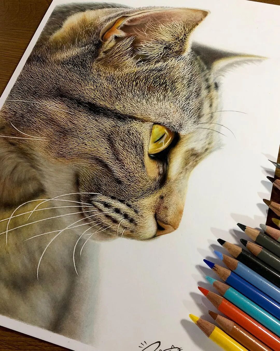 值得一提的是,工藤春树的超写实画作都是用彩色铅笔绘制而成,用彩色铅笔画到如此精细的程度,他算得上佼佼者了,工藤春树在绘制超写实彩铅画作的时候,会先用铅笔素描来起稿,然后再利用不同色彩的彩色铅笔为猫增加上颜色,我们即使不用放大图片,都可以看到工藤春树为猫描绘出来极其细致的毛发与灵动的大眼睛。