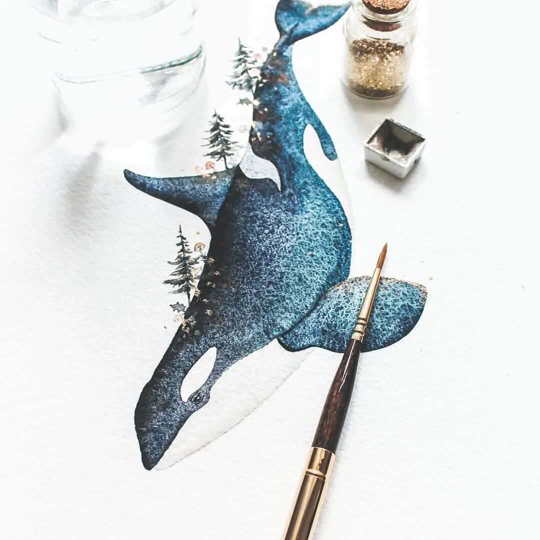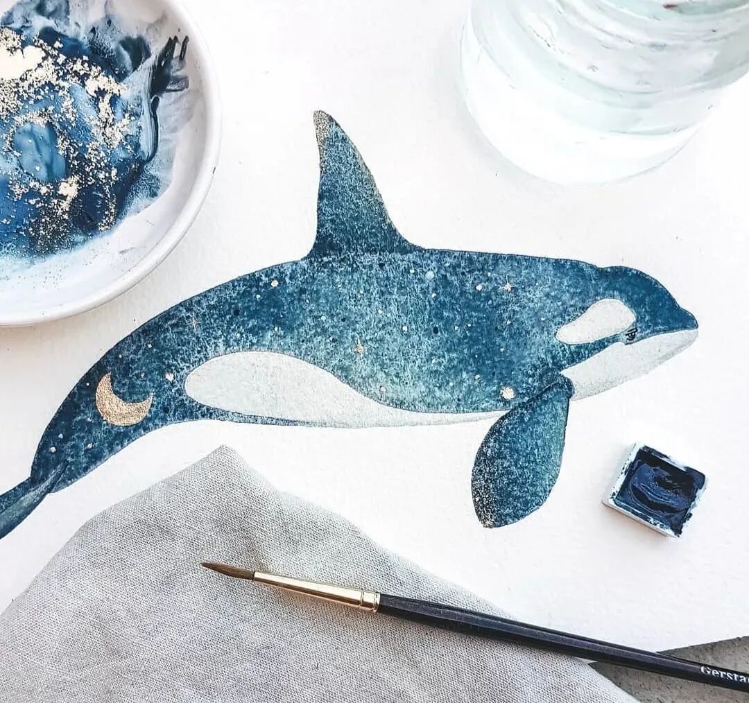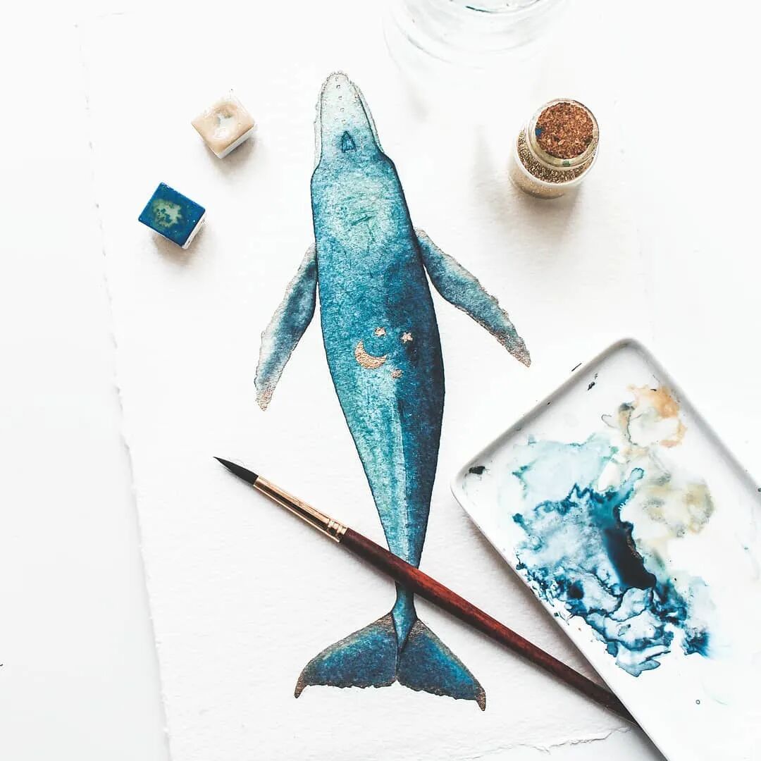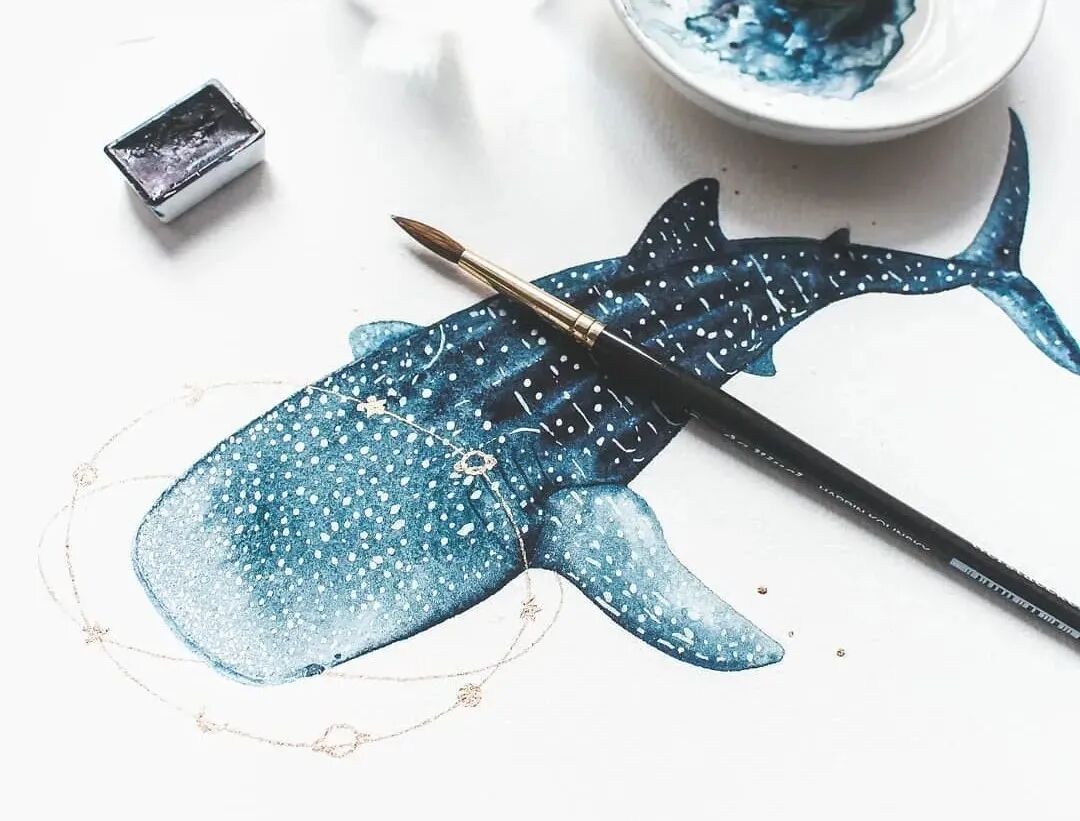 卡南·埃森的鲸鱼画作在于写实和超现实之间,在她的插画中,鲸鱼在纸张上飞舞,每一只鲸鱼都是非常特殊的存在,卡南·埃森在绘制完这些鲸鱼插画后,还会选择性的增加金箔进行点缀,这些金箔更增加画面的空灵感,让人看到后感觉非常舒服。