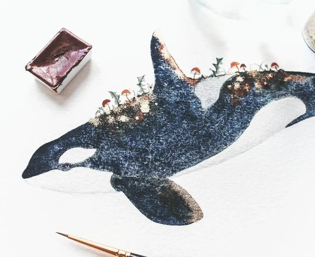来自德国的插画家卡南·埃森,就是一位擅长描绘鲸鱼的艺术家,在她的笔下我们可以看到蓝鲸、虎鲸、座头鲸等等,这些巨大的鲸鱼,在插画家笔下显得轻盈优雅起来。