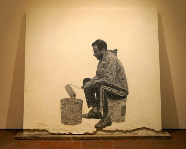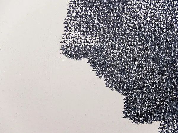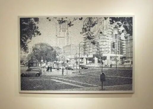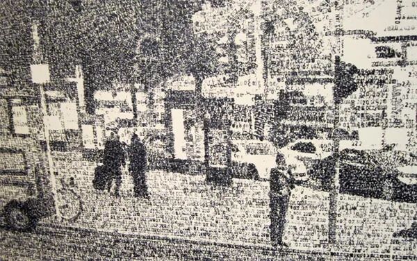 说起来比较简单,但是,要用橡皮日期印章一下下的戳出一幅画作来,比我们用笔画出一幅还要复杂和困难的多。一旦处理不好,就会给人留下混乱的感觉,而费德里科·皮特雷拉用橡皮日期印章戳出来的画作,并没有让我们感觉到混乱,反而不仔细去观察都不会发现一个个细小的字符。