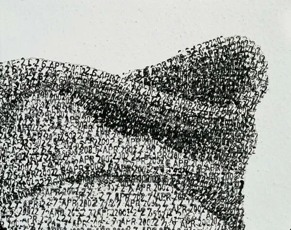 橡皮日期印章使用起来相对方便,只需沾取油墨后,再按到纸上印章上的字符就会出现。费德里科·皮特雷拉的绘画作品也可以说是用字符组成的画作,通过疏密和浓淡的字符,就可以画出非常精彩的黑白画作了。