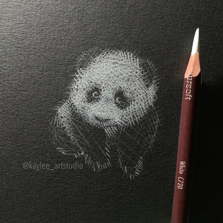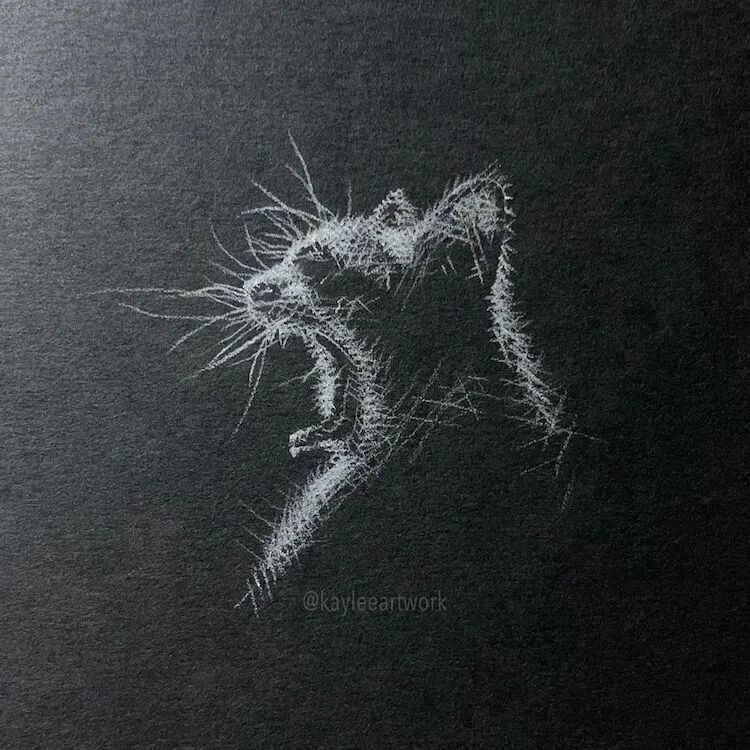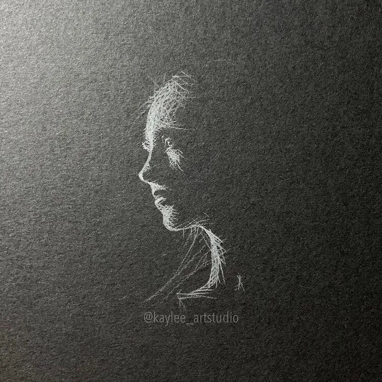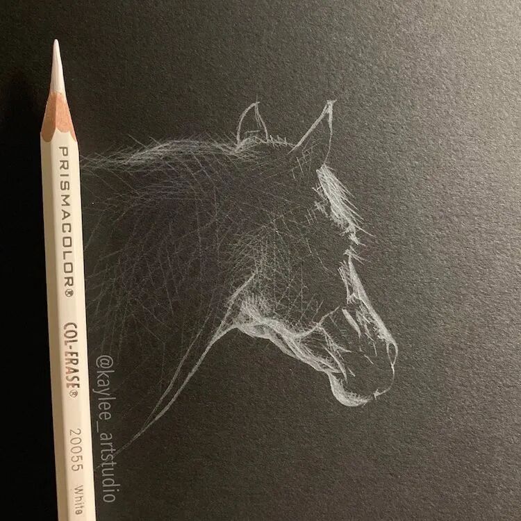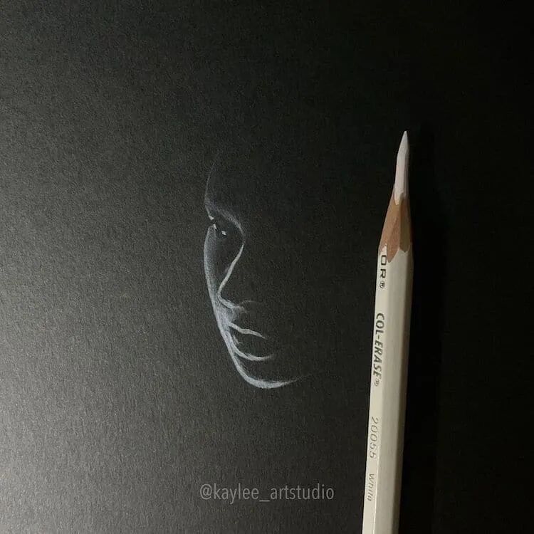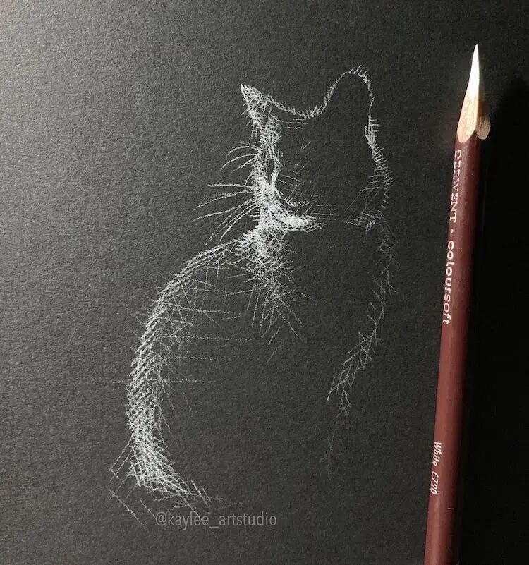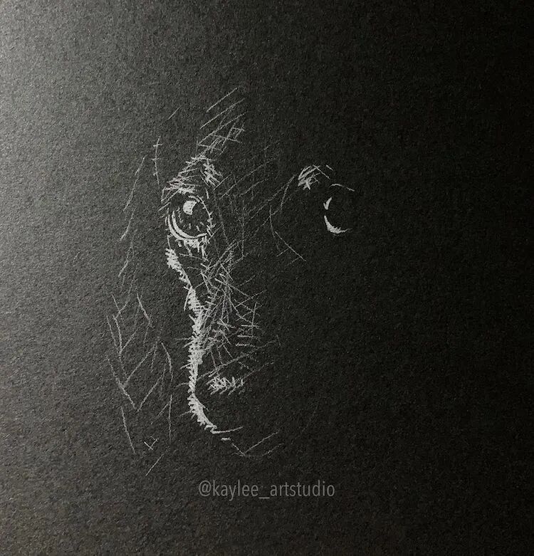 这种负像画作绘制并不算复杂,只需要确定好一个较强的光源,然后想想强光照射到物体上,然后,在黑色的卡纸上,用白色的铅笔画出光线最为明亮的地方,一幅负像画作就完成了。李凯作品之所以引人注目的另外一个原因就是他采用看似简单的交叉线条去进行绘制,这些让人一眼就可以看出来的交叉线条,非但没有影响画作的完整性,反而让他李凯的作品更具有神秘感和空间感。
