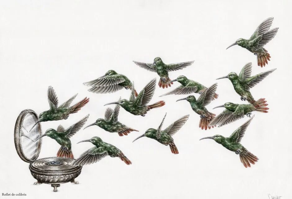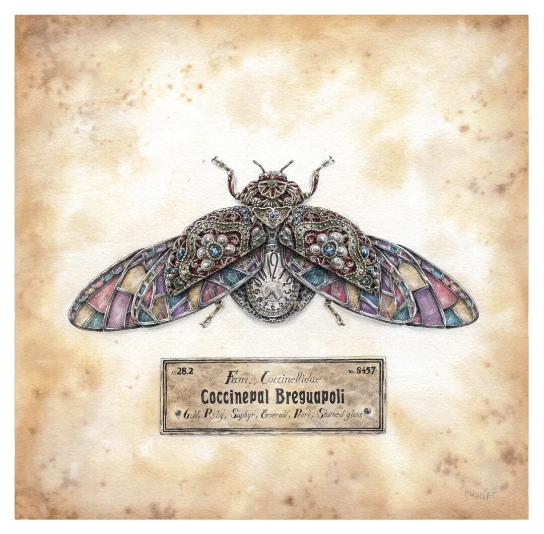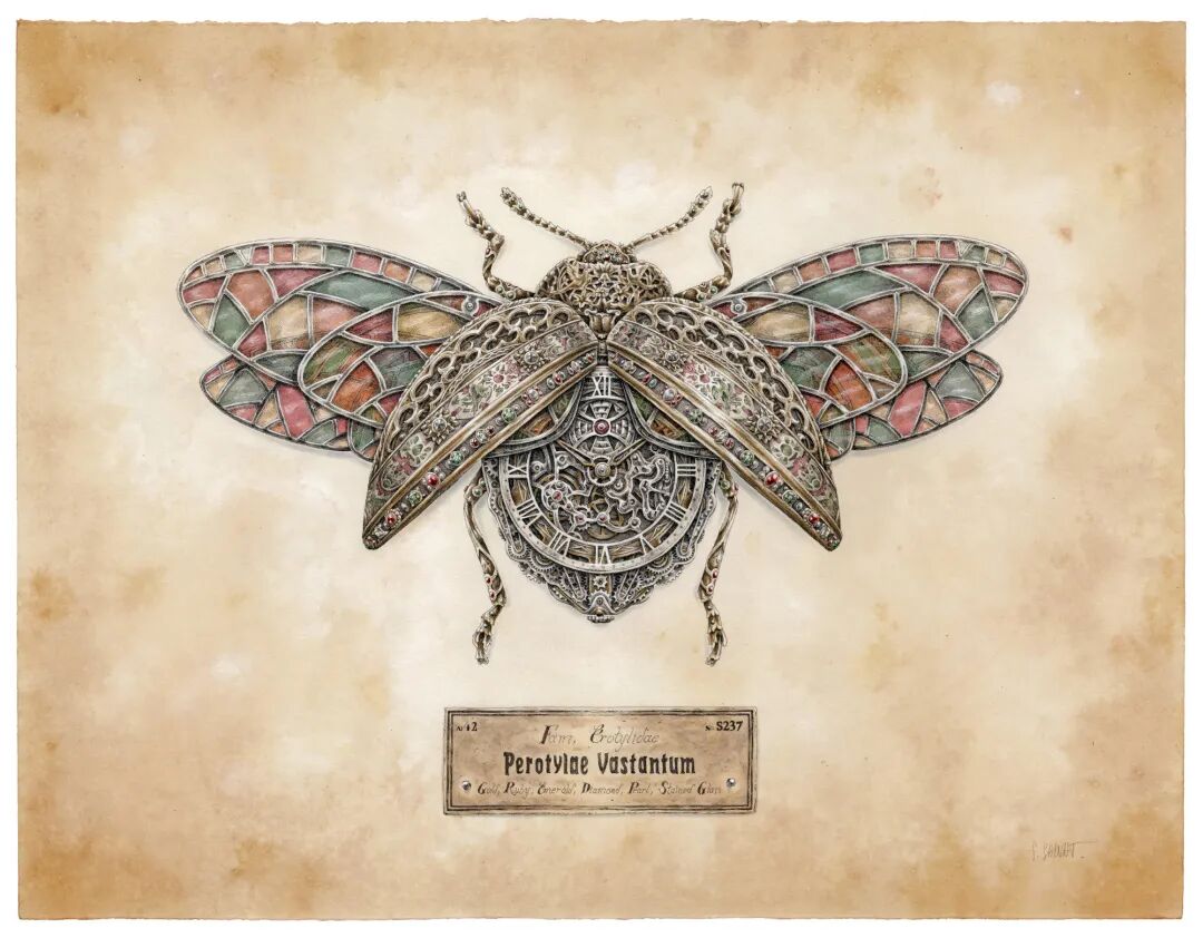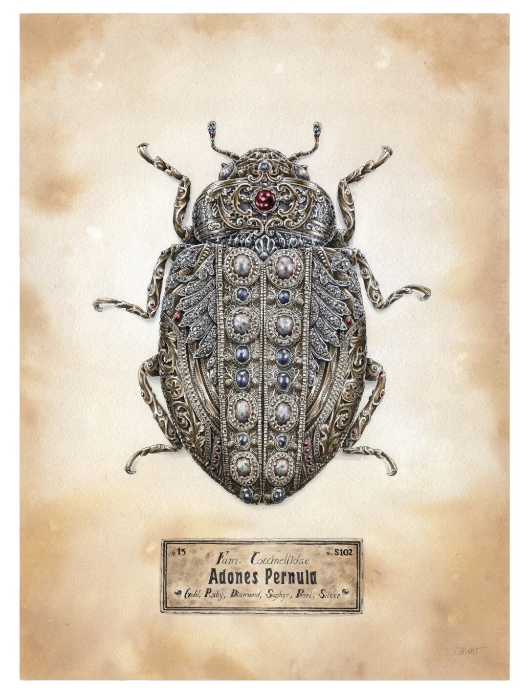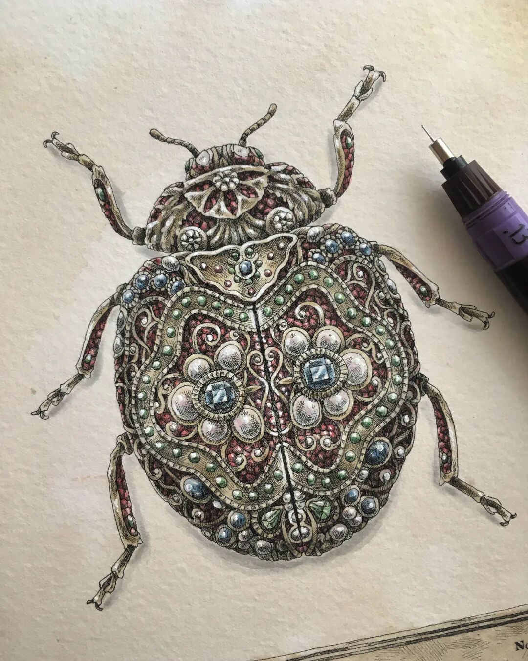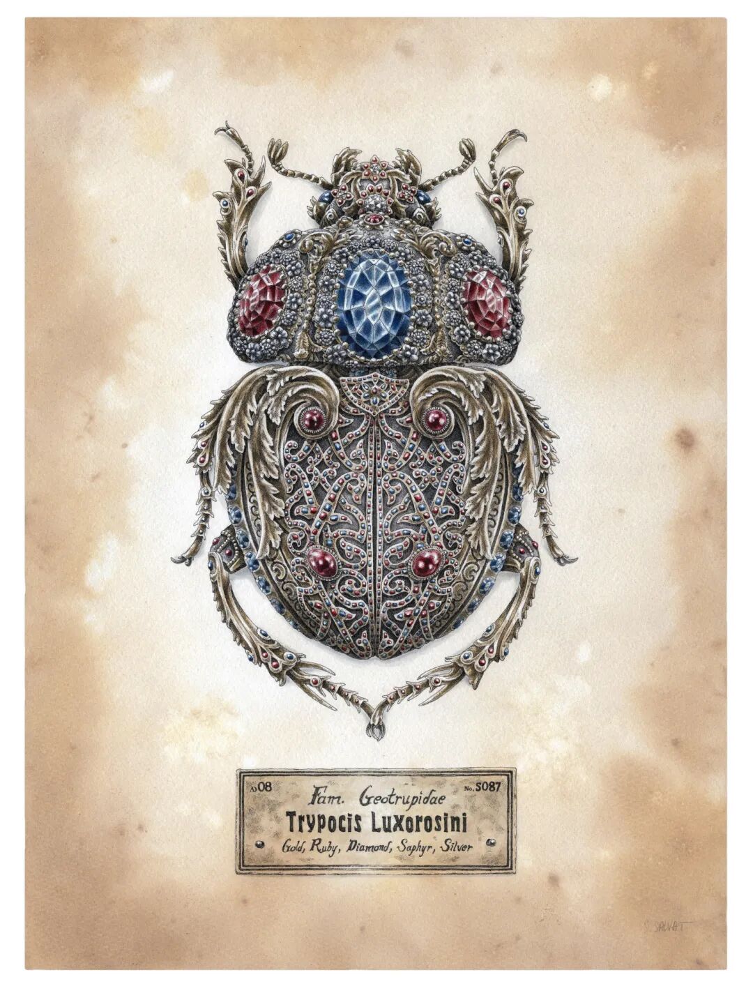 斯蒂文·萨尔瓦特的绘画作品以精细著称,他的作品并不是超写实,却给人一种超级精致的感觉,艺术家笔下的昆虫都仿佛是用珠宝镶嵌而成,其他动物也非常有质感,而完成这样精致又逼真的作品,斯蒂文·萨尔瓦特仅仅使用了针管笔,外加一点点水彩颜料。