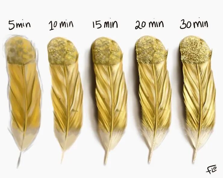 5分钟、10分钟、15分钟、20分钟和30分钟完成的羽毛。