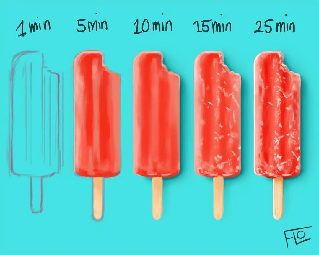 1分钟、5分钟、10分钟、15分钟与25分钟画成的雪糕。