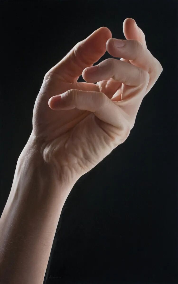 随着对绘画的理解越来越深,他开始转型成为一位超写实画家,同时,也将手部作为他绘画的主角去描绘,在哈维尔·阿里扎巴卢的手部绘画中,我们可以看到黑灰的背景,只有一只姿态不一的手,除此之外再也没有其他多余的东西,从这样的画面上来看,他对于自己的超写实绘画非常自信。