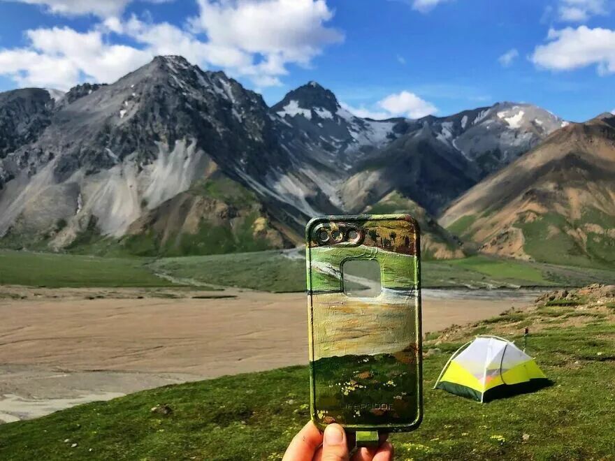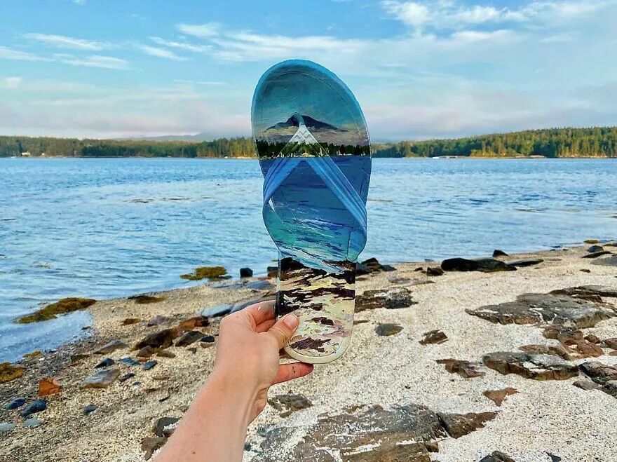 玛丽亚·雷丁并没有购买纸张和画布,而是用游客扔在景区里的垃圾创作作品,她把这些易拉罐、拖鞋、矿泉水瓶等垃圾当成画布,在上面画出与周围风景相匹配的美丽山水画。因此来告诉人们,没有这些垃圾的存在,这里的风景该是多么的迷人,充满魅力。