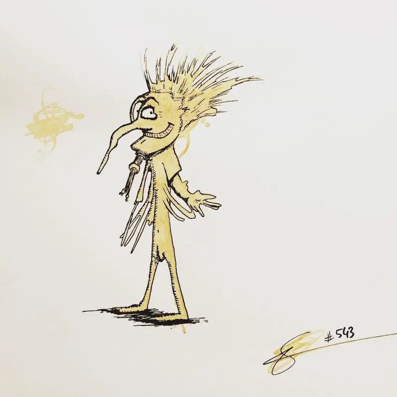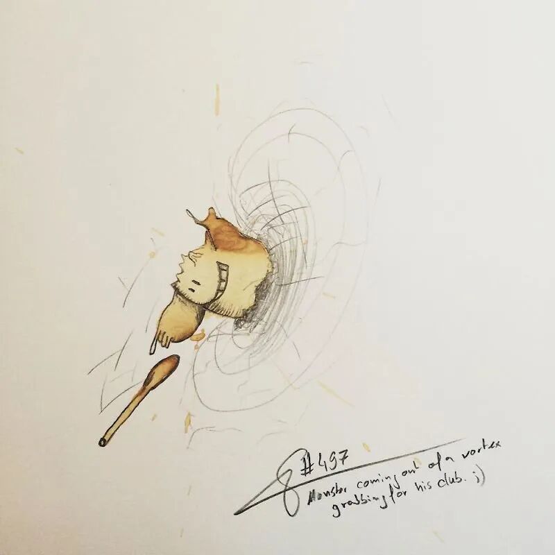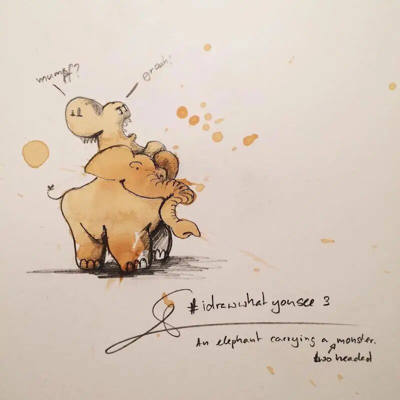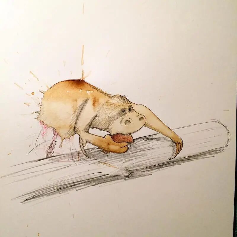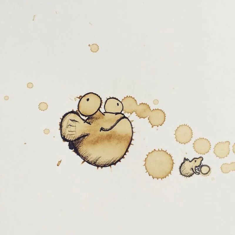 这个灵感,也是来自于一次会议上,斯特凡意外地将一杯咖啡洒在笔记本上,于是他画出了人生中第一个咖啡渍插画,从此,他便开始了这个有趣的咖啡渍系列插画的创作,一个个可爱的、栩栩如生的小生物,在斯特凡寥寥数笔之后,便出现了。