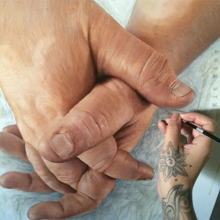 才华横溢的加拿大艺术家基特·金就是一个用眼睛画画的超写实艺术家,他的作品不仅写实,尺幅还十分巨大。基特·金出生于一个艺术世家,父母都是艺术家,从先耳濡目染,对艺术的爱也是从小就萌发了。他的父母教给他的最重要的东西就是,不要用手去画画,而是用眼睛去感受,去捕捉,手只是一个绘画工具而已。
