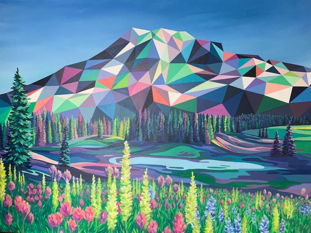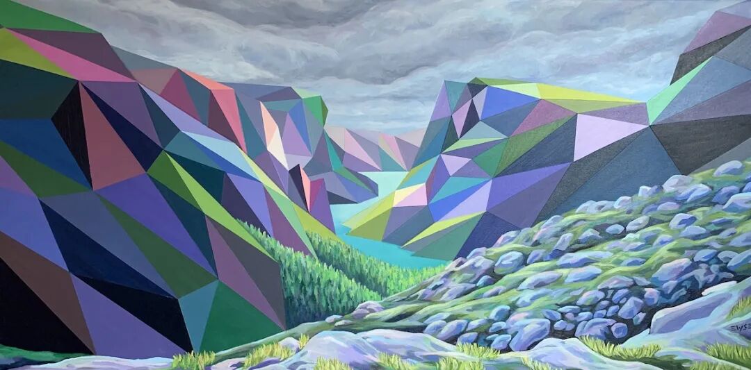 在大家的印象里,山给人的感觉就是巍峨、雄壮,但是爱丽舍·道奇对山的看法却有所不同,在她的眼中,山峰和悬崖都是三角形,并且,它们一直都在运动和变化之中。因此,她画出来的山景也是十分独特,丰富的几何形式和色彩搭配,形成了令人眼花缭乱的几何风景艺术。
