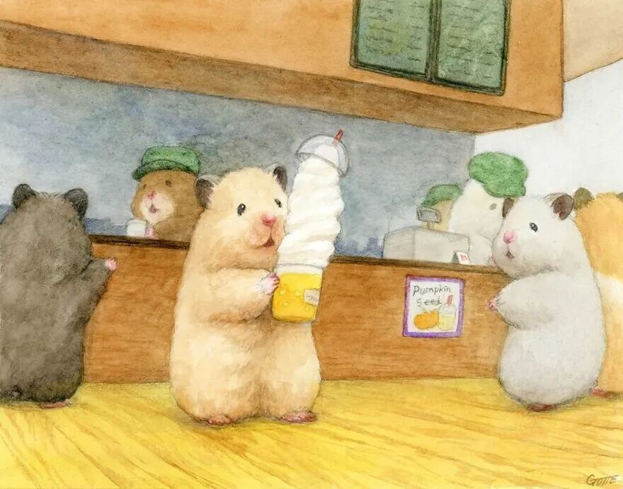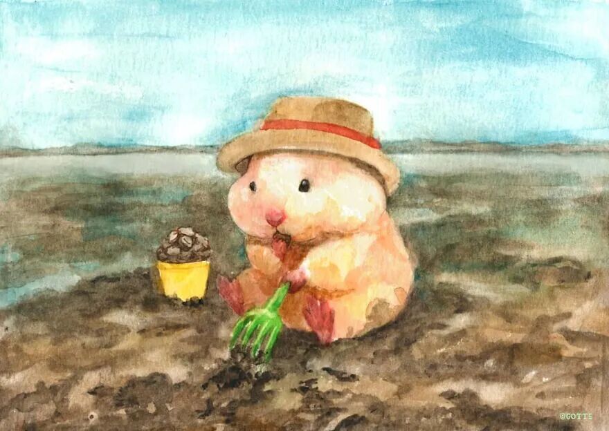 戈特用水彩画的形式,创作了一系列仓鼠的日常生活,清新的绘画方式和配色,让一切都变得十分可爱。欣赏戈特的插画,感觉就是简单、放松、舒服,他画中的仓鼠像人类一样生活,他从事着平凡的工作,有时候也会遇到一些小烦恼和小挫折,但是它乐观又努力,没有被生活打倒。很多人看到画中的仓鼠,就仿佛看到了自己一样。