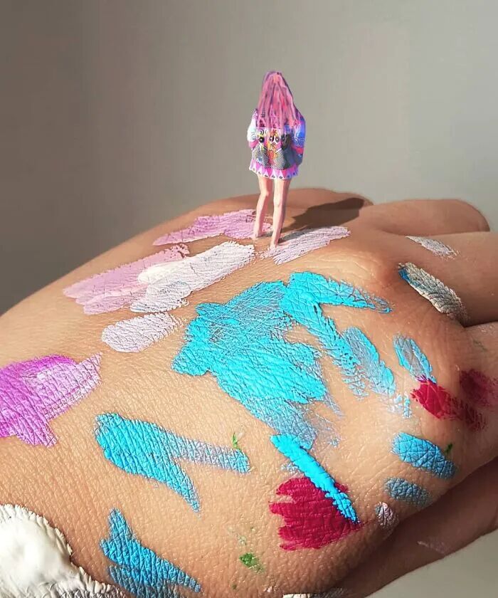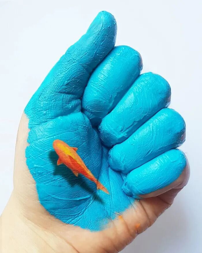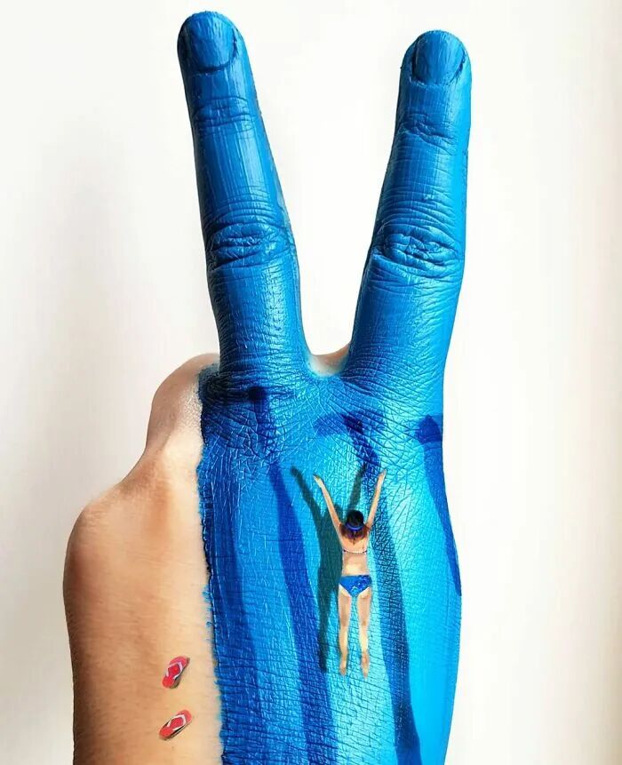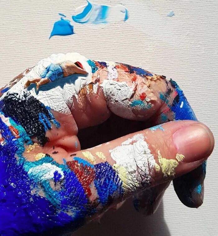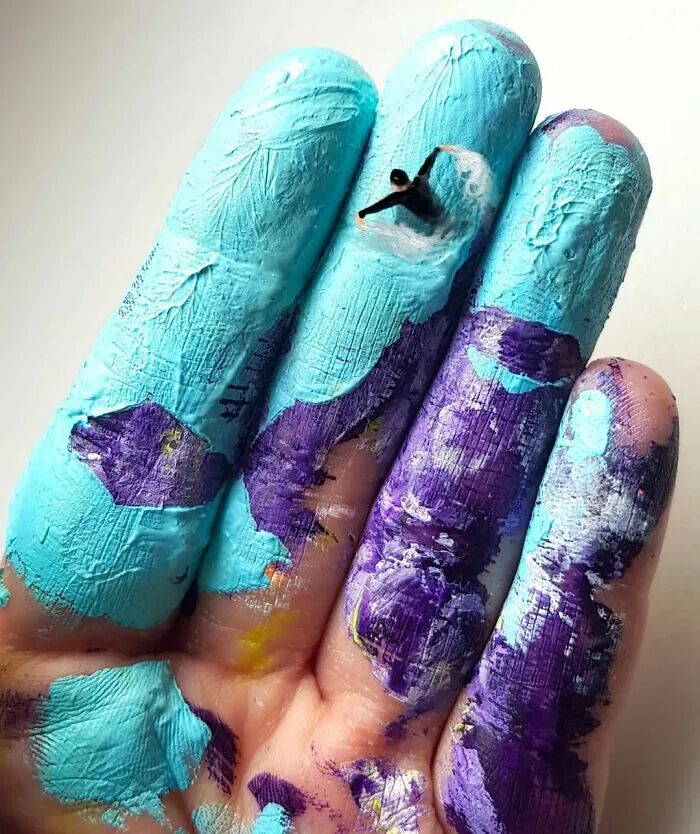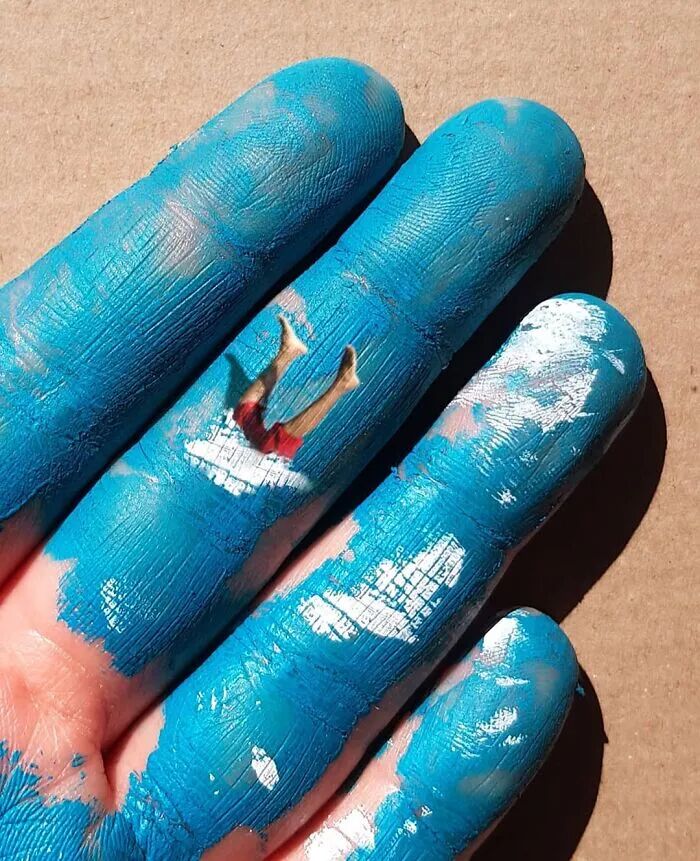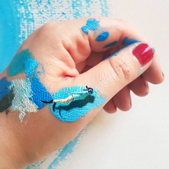 今天小绛要跟大家分享的戈尔萨·戈尔奇尼的绘画作品,就是她在自己的手心里亲自手绘的微型写实绘画,有多写实呢?这么说吧,如果你忽略掉她的手,会以为面前就有一片蔚蓝的海洋,人们在此肆意地游泳、冲浪,享受大海的乐趣。她的作品色彩丰富,细节也很丰富,带给人非常强的3D感,这些小画看上去,就像是一个个真实的场景,而艺术家用自己的双手作为画布,展示了一个微型的海洋乐园。