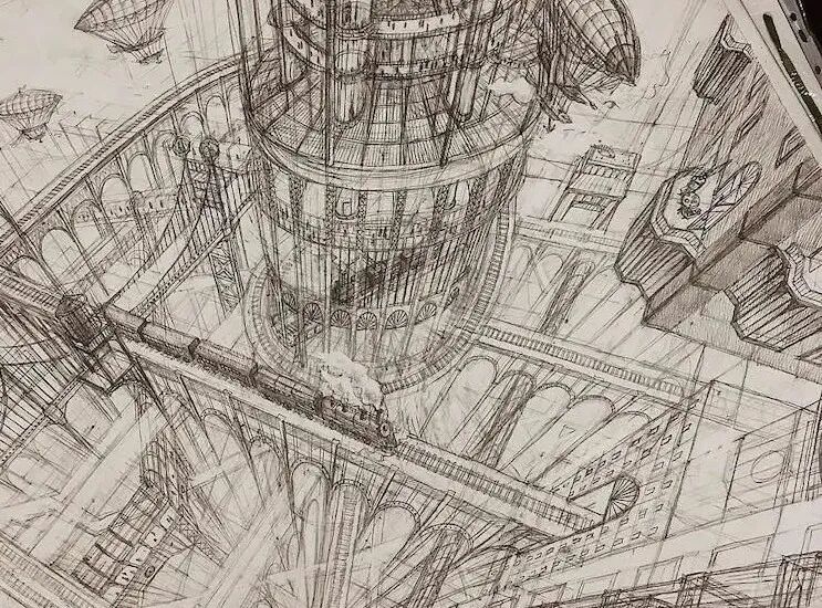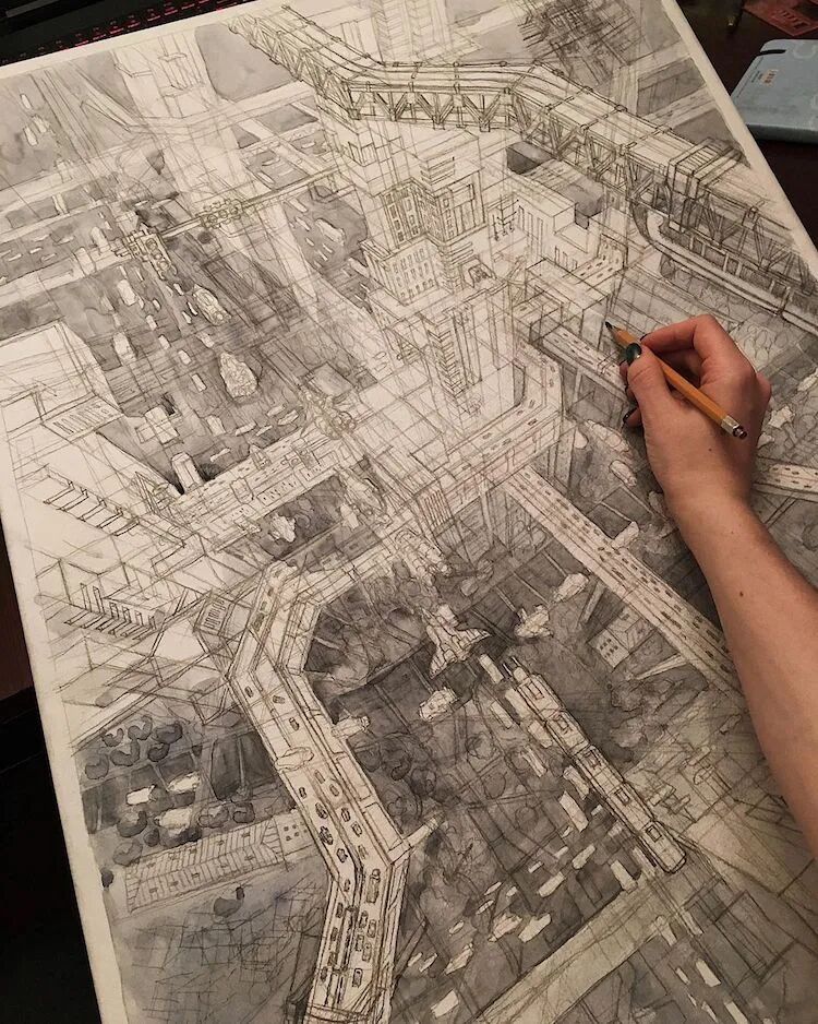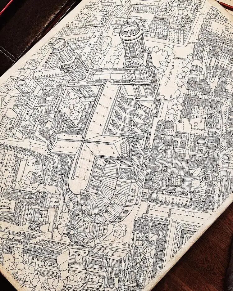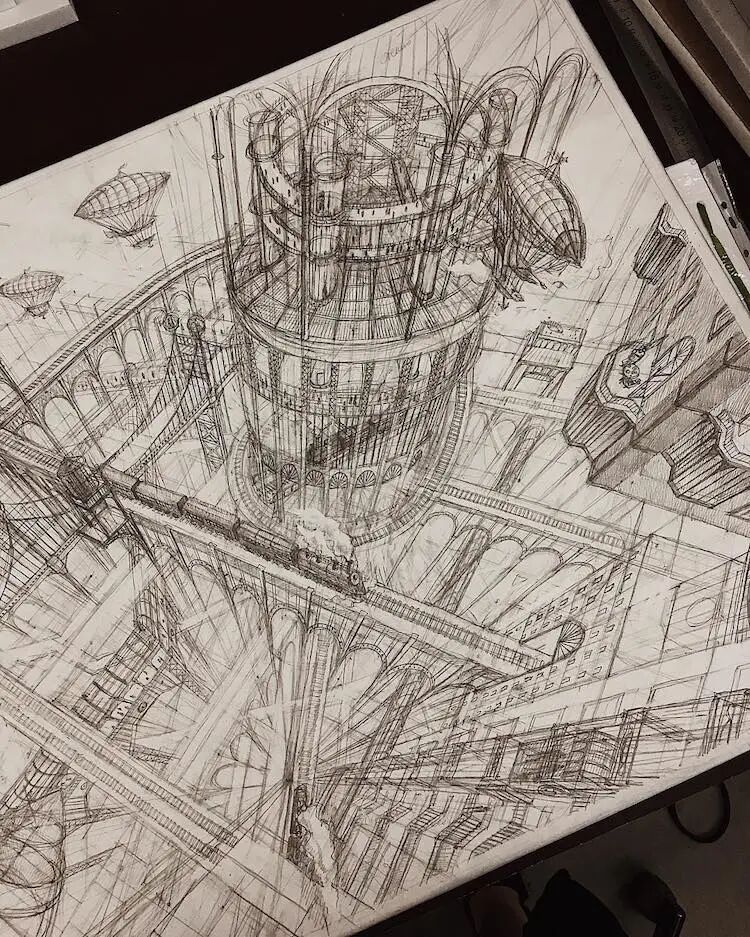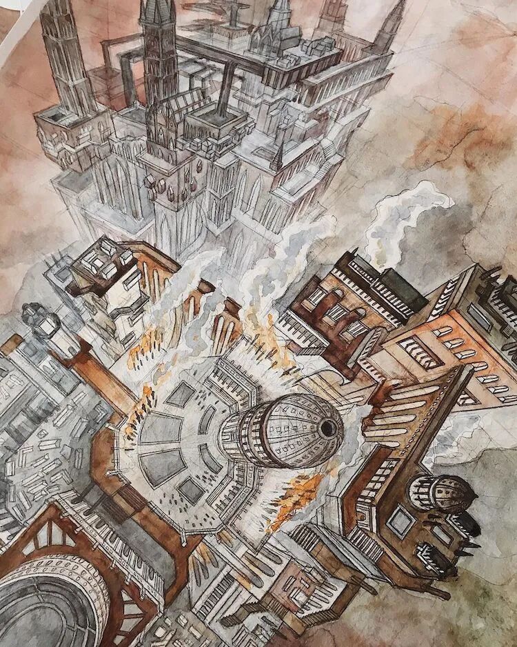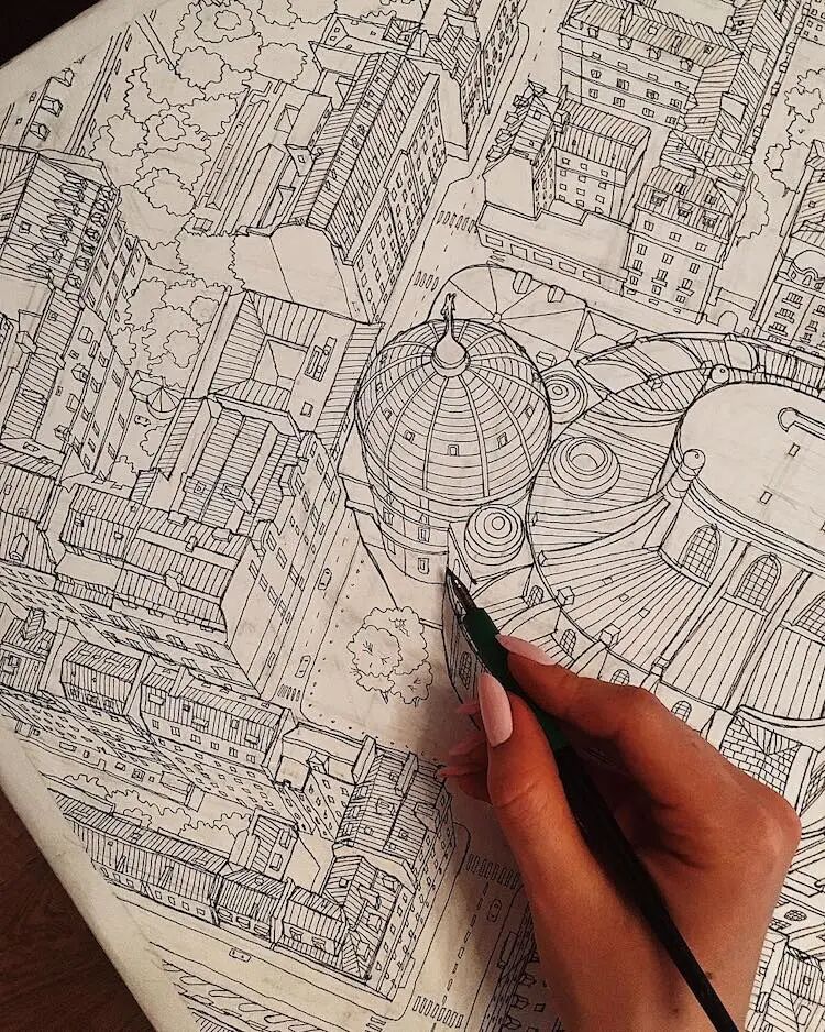 这组鸟瞰图全部由手工绘制,我们可以从她的作品中看到耸入云霄的楼房,也可以看到精细到解构的老式火车。每一个场景艾西鲁·扎里波娃都力求完美,透视效果让人无话可说。