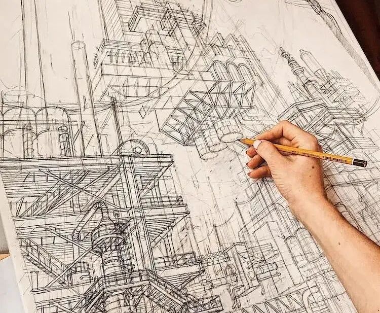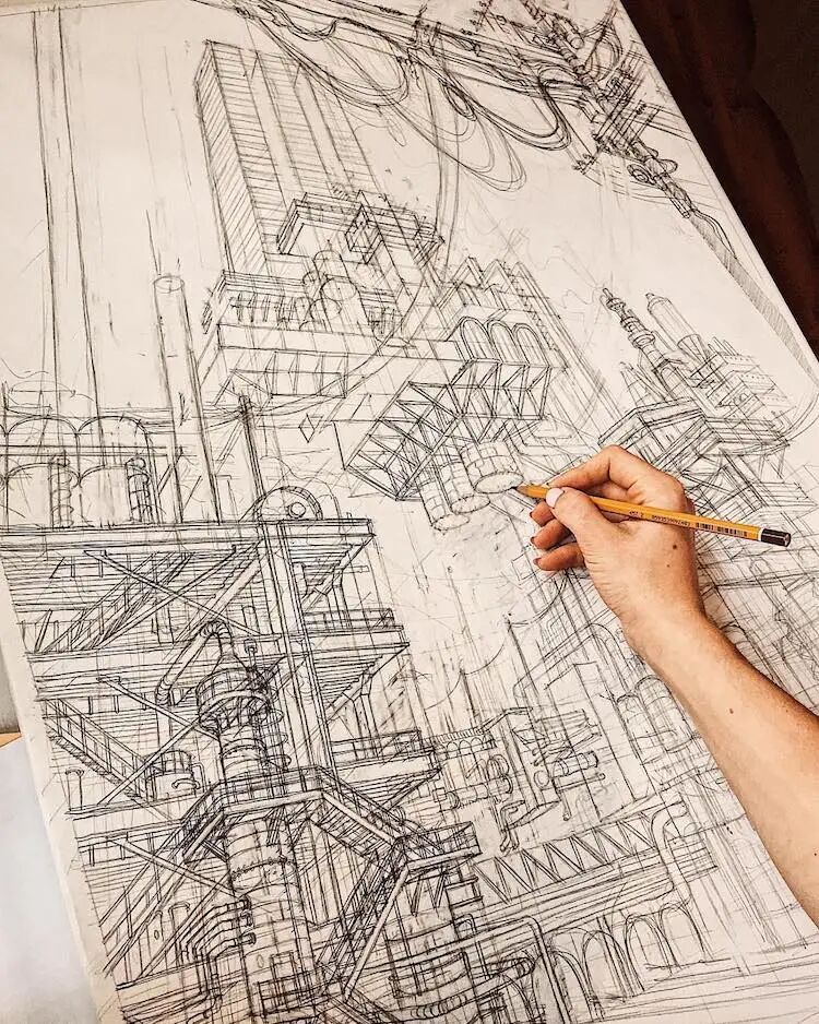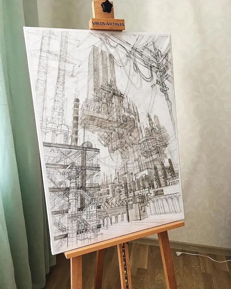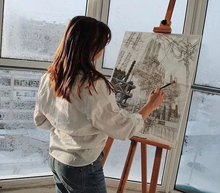 艾西鲁·扎里波娃在创作这些作品时,会用铅笔制作草图,她从草图就开始测量,密集的线条并没有让人感觉混乱,反而给人一种特殊的美感,在草图完成后,艾西鲁·扎里波娃会用墨水和水彩将它们覆盖,这样一幅由从事建筑和工程专业的人,绘制而成的作品,让人看不到任何破绽,每一个细节都非常生动。