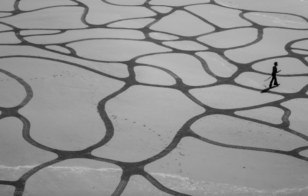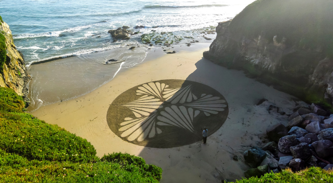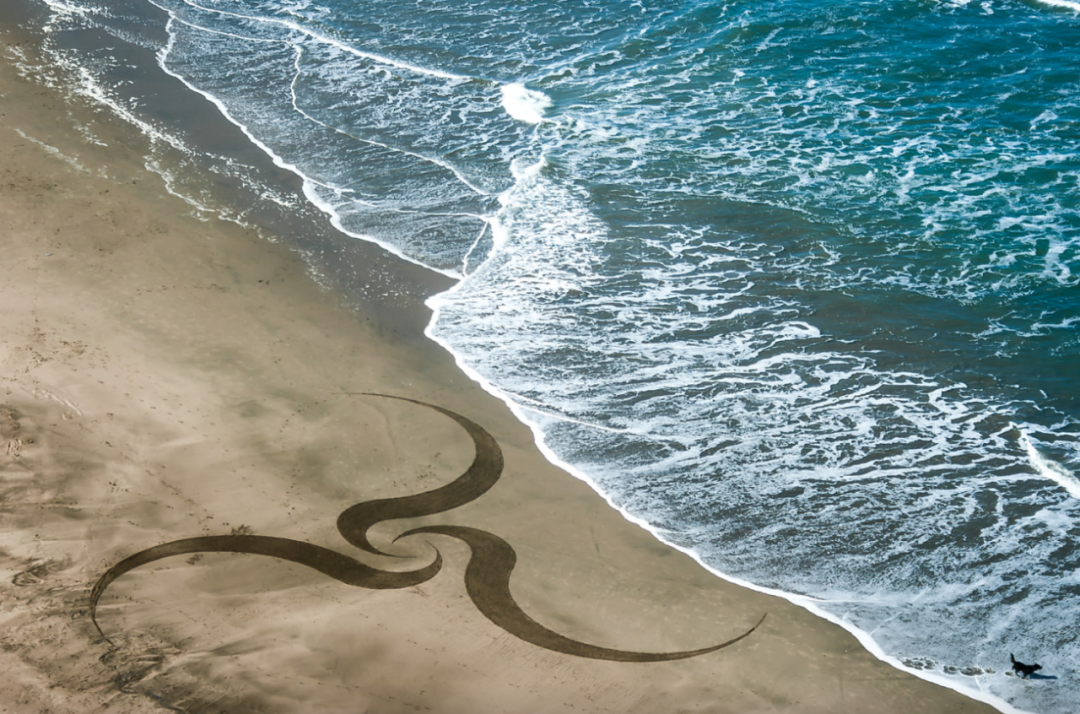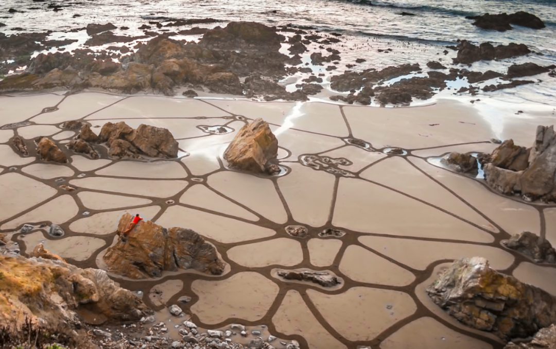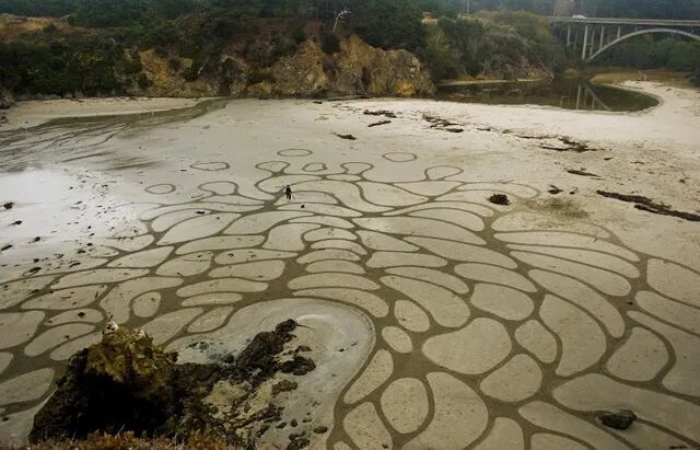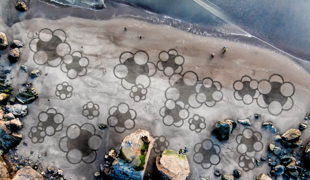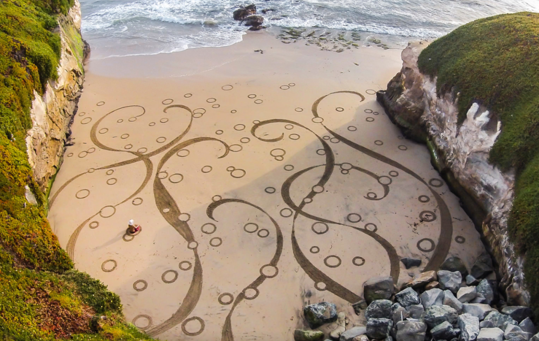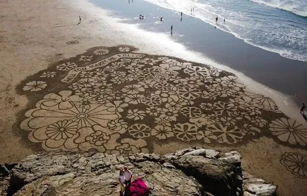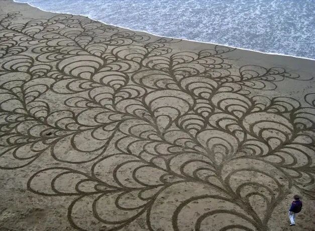 安德烈斯·阿玛多的大地艺术作品最大可以达到3000,4000平方米大小,不过,在沙滩上创作艺术作品,并不是一件轻松的事,这项艺术创作“时间紧、任务重”,艺术家需要在落潮的时候开始创作,在涨潮之前将作品创作完成。