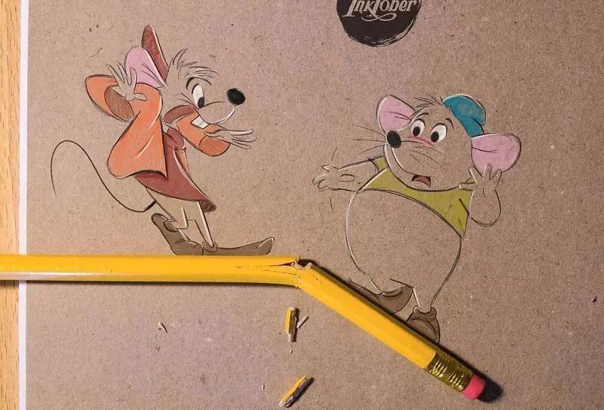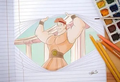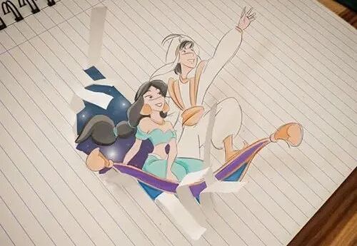 在路易吉·凯莫·沃洛的画作中,我们可以看到许许多多经典的动漫形象,例如:狮子王、爱丽丝、阿拉丁等等。正这些动漫角色,跳出了纸张,出现在我们眼前。