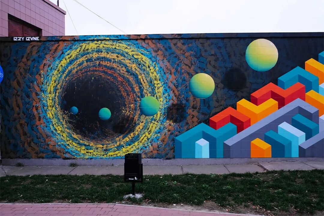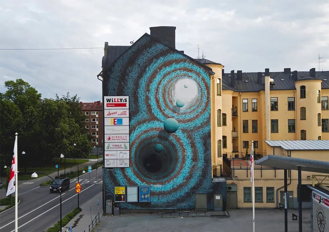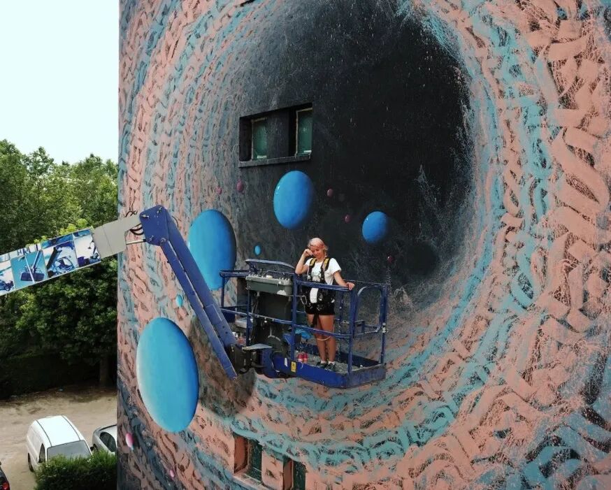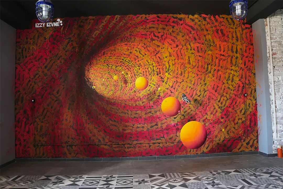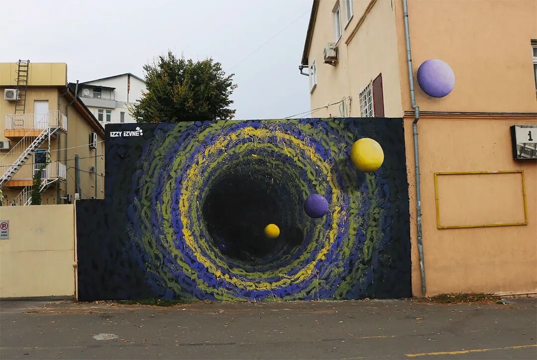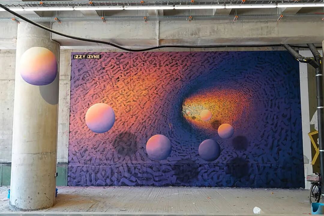 伊兹的作品很有自己的个人风格,由于从小对浩瀚宇宙的向往和热爱,她在自己的壁画创作中也融入了宇宙的元素,从而形成了真正属于她的独特风格,最令人佩服的地方在于,伊兹打破传统街头壁画的创作模式,将绘画与错觉相结合,创作出了独特的大型3D壁画,墙壁仿佛将我们带入了另一个宇宙中,让人感到身临其境,眼花缭乱。