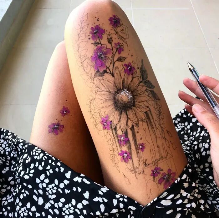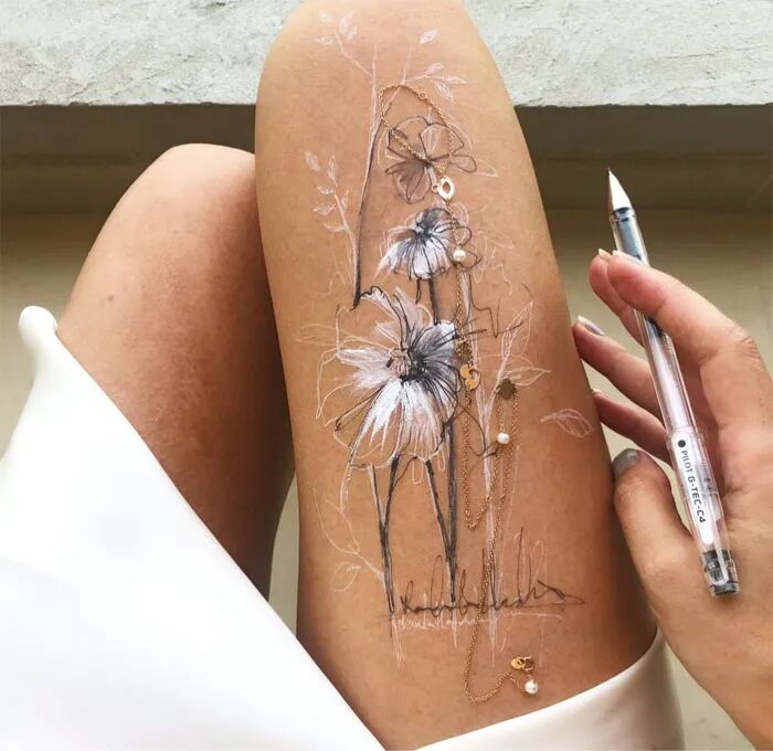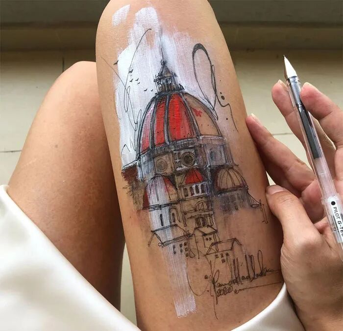 她的作品优雅,细腻,很像纹身,但又比纹身更加复杂精致,也能够轻易地洗掉。花卉图案、建筑结构是她作品中的主要元素。谈及在大腿上画画的灵感和初衷,兰达·哈达丁说是源自自己童年时期的执念,因为在小的时候很喜欢在手上、腿上、衣服上随意乱画,但总是被制止和批评,这才导致她想要创作这样的作品。