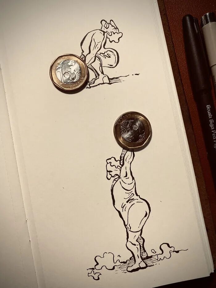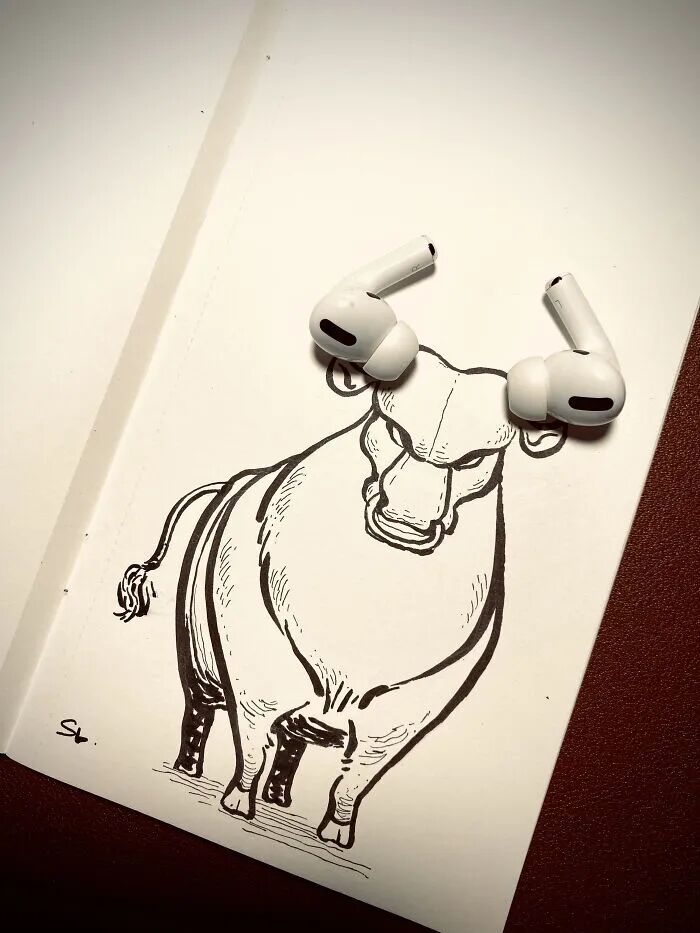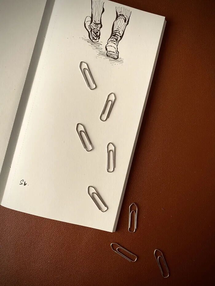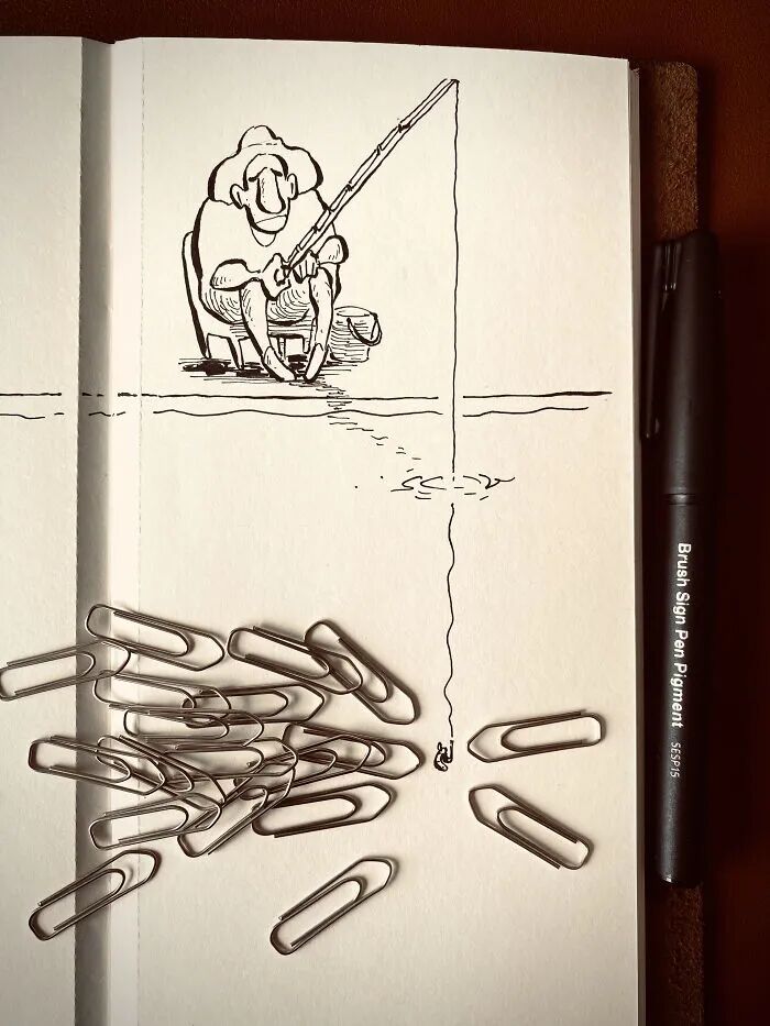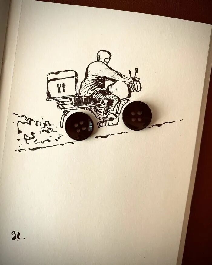 寥寥数笔,就是一个生动有趣的故事,值得一提的是,山姆·雷的创作还利用上了我们生活中很多常见的小东西,比如硬币、别针、耳机等等,它们与艺术家的插画结合在一起,构成一个个生动的故事场景,让人看了心情愉悦。