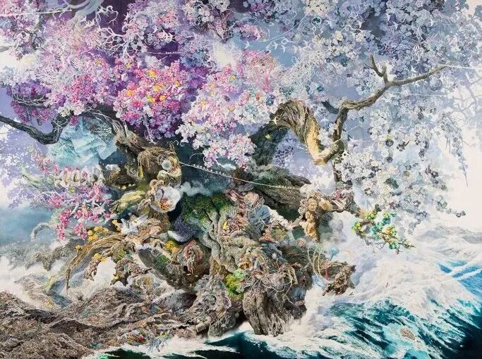 这幅名为《重生》画作描绘的是一颗巨大的樱花树,它被冲天的海啸掀起了许多根茎,但是还紧紧的抓牢地面,在樱花树后面,有着成千上万个细节,如果你仔细看可以看到许多人、动物、植物、建筑等等。