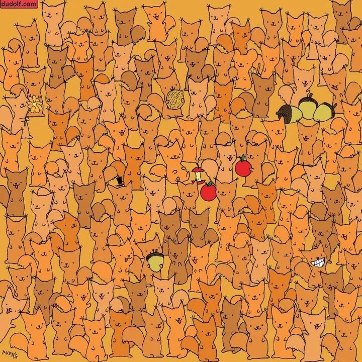 匈牙利一位插画艺术家深谙这种游戏的迷人奥妙,他另辟蹊径,以插画的形式,也创造了一系列极富挑战性的作品,在这些由同一元素构成的画作中,总有那么一两个“异类”,是我们第一眼看去很难发现的,需要仔细查找细节,才能找到。
