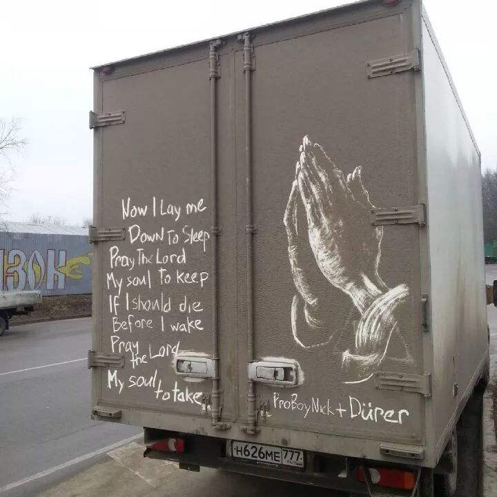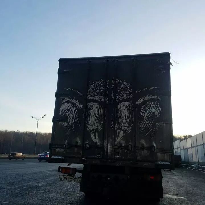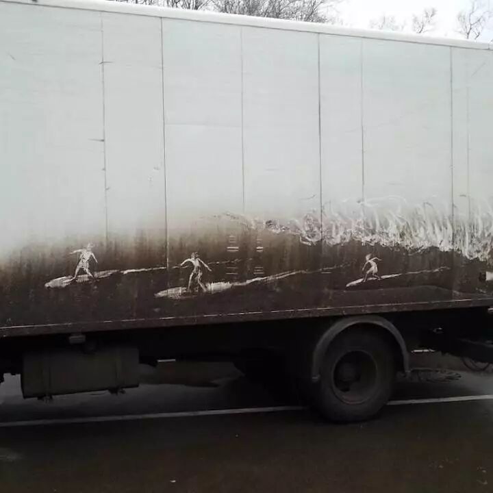 对于尼基塔来说,最喜欢用来创作的汽车就是大货车,因为体型较大可以用来画画的面积很大,且常常因为长途运输更容易满是灰尘,是最佳的画板。