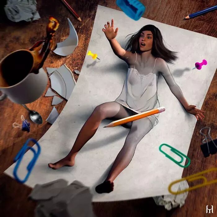 在这种3D绘画的基础上,许多从业艺术家又延伸出来许多有趣的作品。来自巴西的艺术家图利乌斯·豪雅就是3D绘画中的佼佼者,他的作品超越了3D绘画,利用超现实的画面,给人带来的一种强烈的视觉冲击。