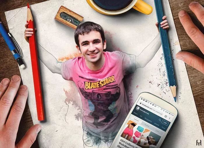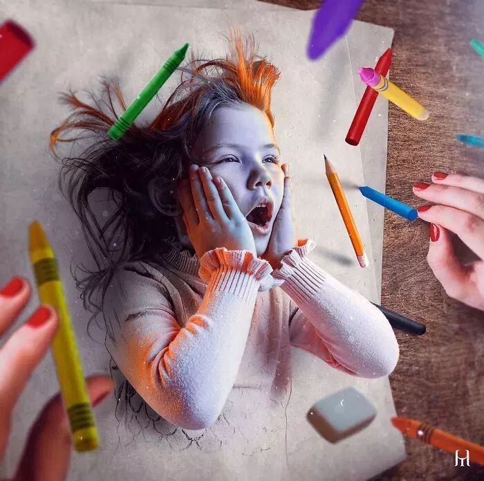 首先,可以确定的是图利乌斯·豪雅的3D绘画并不完全是画出来的,而是图利乌斯·豪雅利用图片编辑技术和绘画技术融合后诞生的作品。在绘画一幅3D绘画前图利乌斯·豪雅会收集相应的素材,一部分画面是需要用铅笔进行绘制,另一部分的画面则需要照片帮忙。