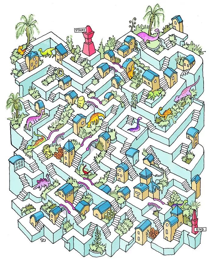 迷宫游戏很有意思,但是许多迷宫游戏太过于简单,让人一眼看过去就知道了正确路径,失去了迷宫游戏的乐趣,在国外一名叫做肖恩·杰克逊的插画师,创作了一种3D艺术迷宫,油画酱试着走了一下,简单的迷宫都需要十分钟左右走到出口,复杂一些的迷宫要花上半个小时左右。